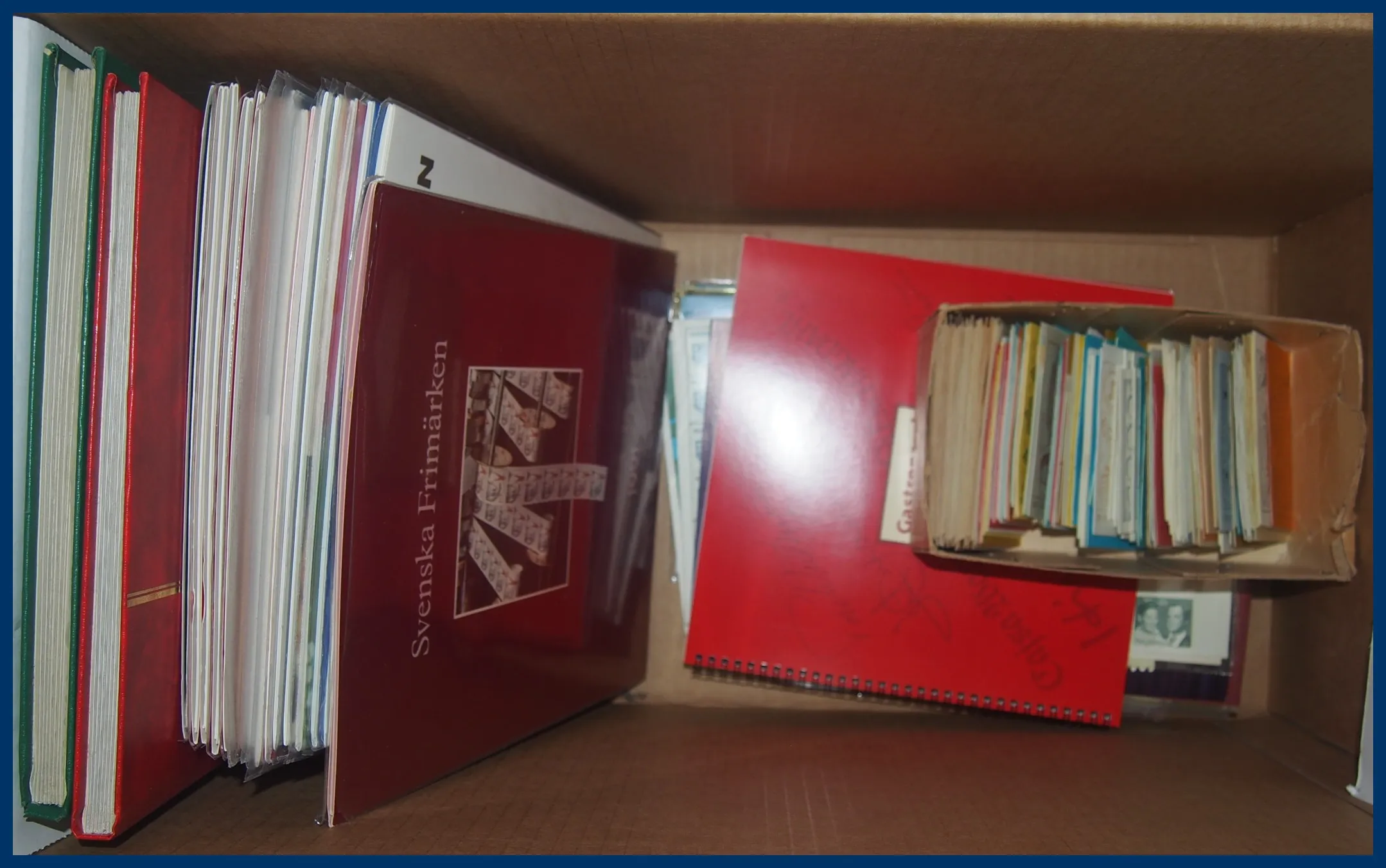 häftesårssatser, presentsatser, häften samt lösa märken i pergamynkuvert och i två glest besatta insticksalbum. Nominal drygt 12.200 kr med stor andel Sverige Brev, inte minst för att samtliga årssatser 1997-2003 finns med. (Julmärken räknade som 21 kr/st). Även mervärde för 120 st rabattfrimärken.