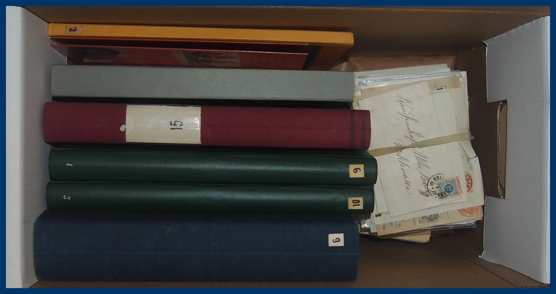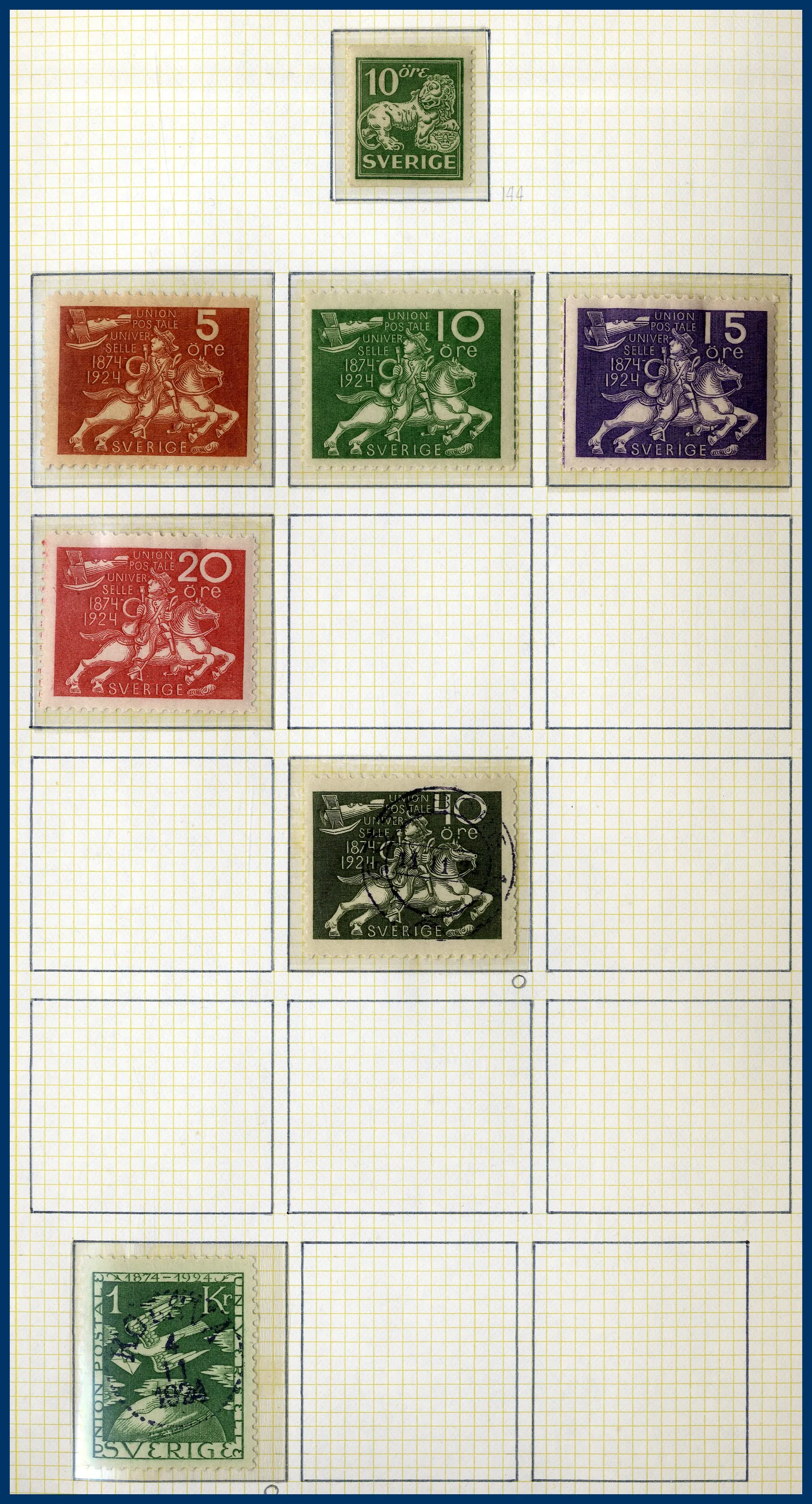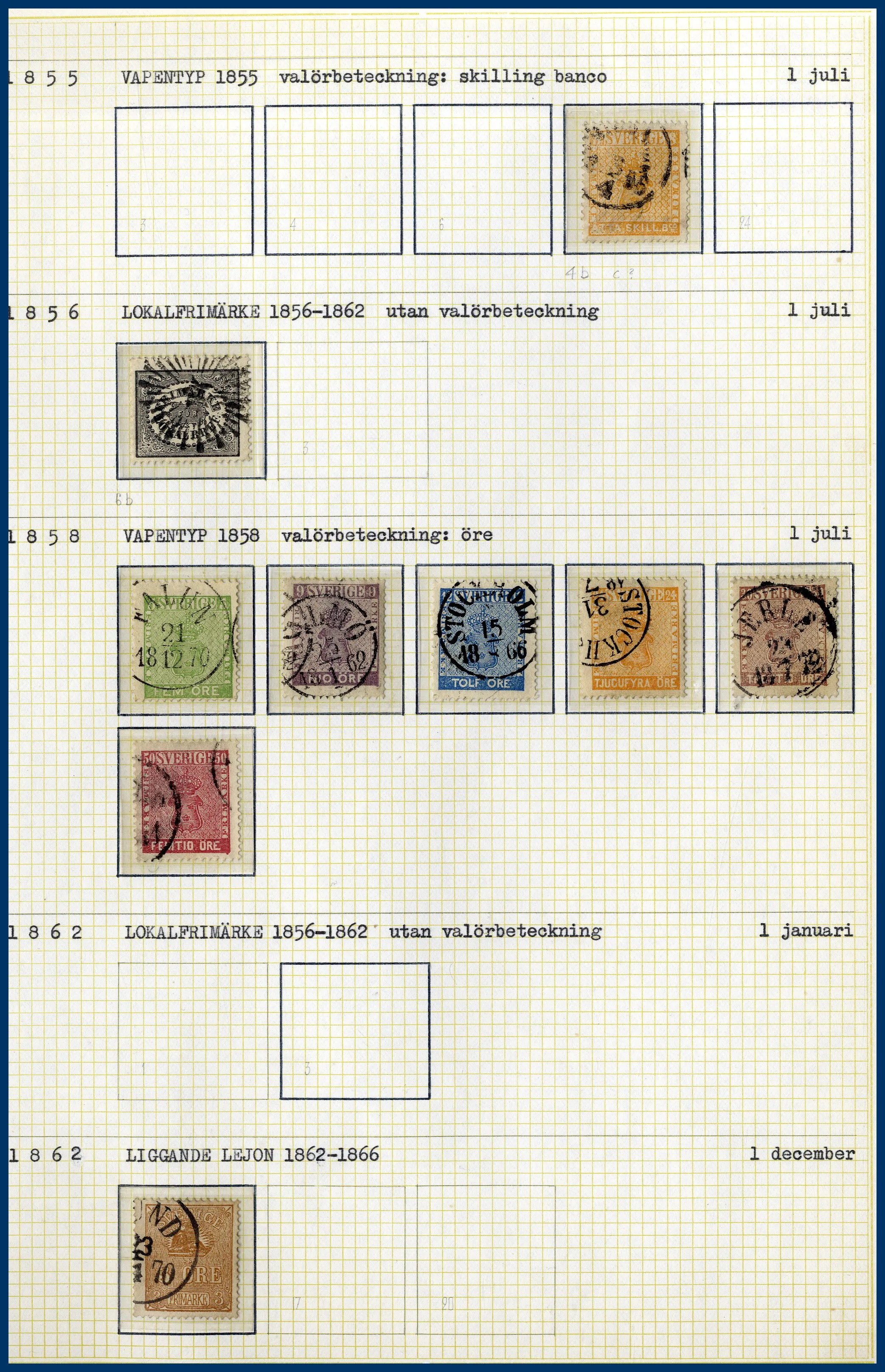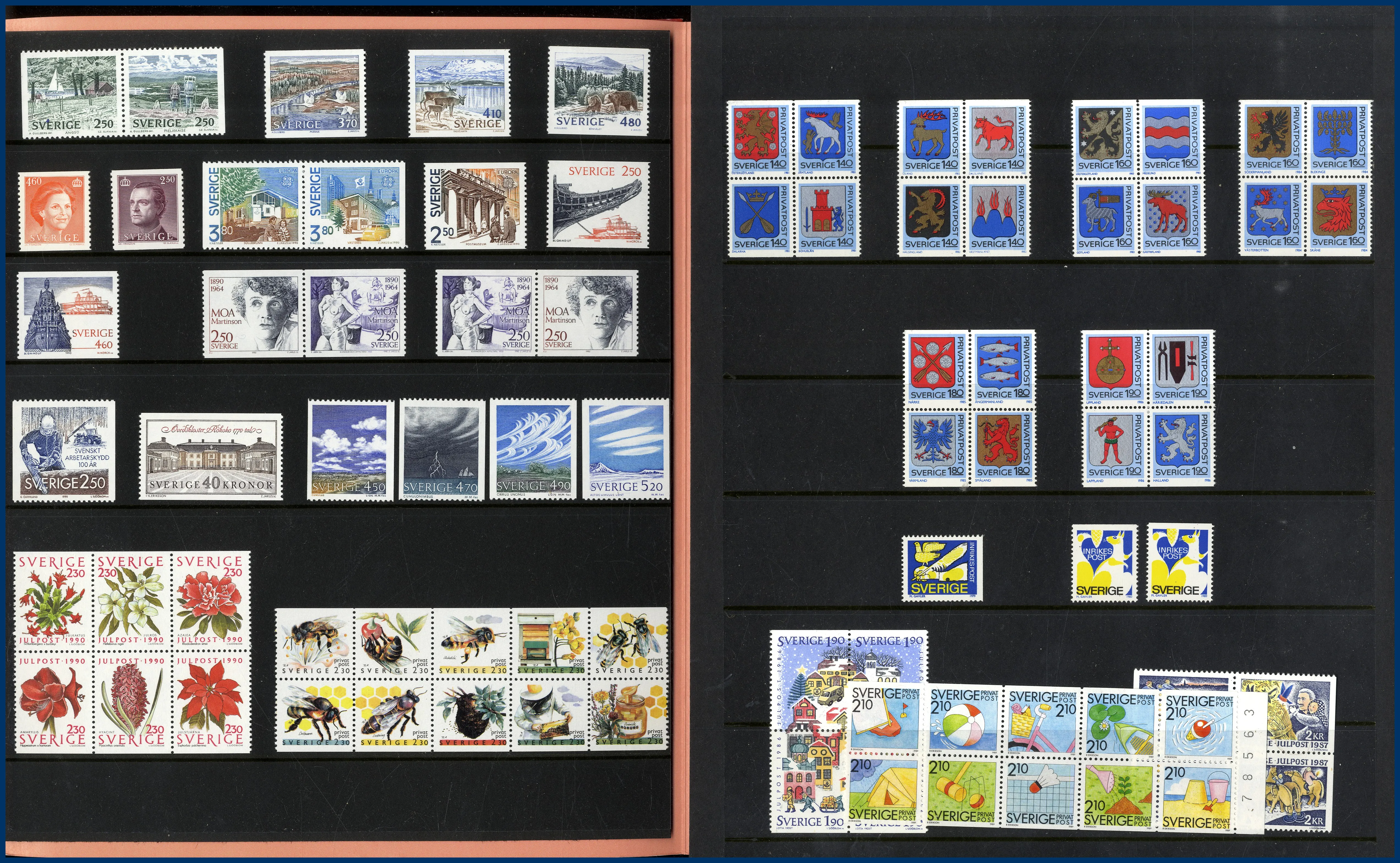 En pärm med en ortstämpelsamling, en samling Sverige 1855 till 1970-talet med bl.a. en 6-skilling, 3 öre Lokal, Slottet och bättre BC-/CB-par. Huvuddelen av samlingen ostämplad med en hel del bättre **. Även snygga stämplar inemellan. Nominal oräknad, men det ingår t.ex. drygt 30 st rabattfrimärken. Även lite frimärken löst i kuvert, en samling julmärken och diverse försändelser. Mycket att gå igenom.