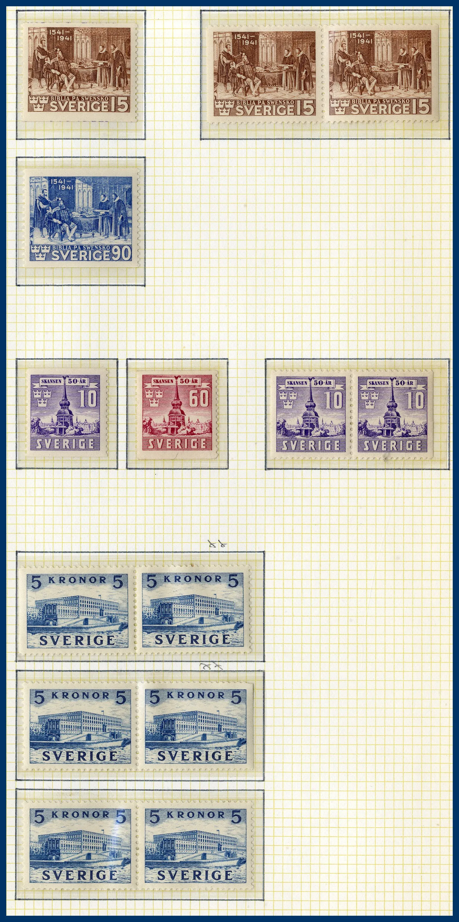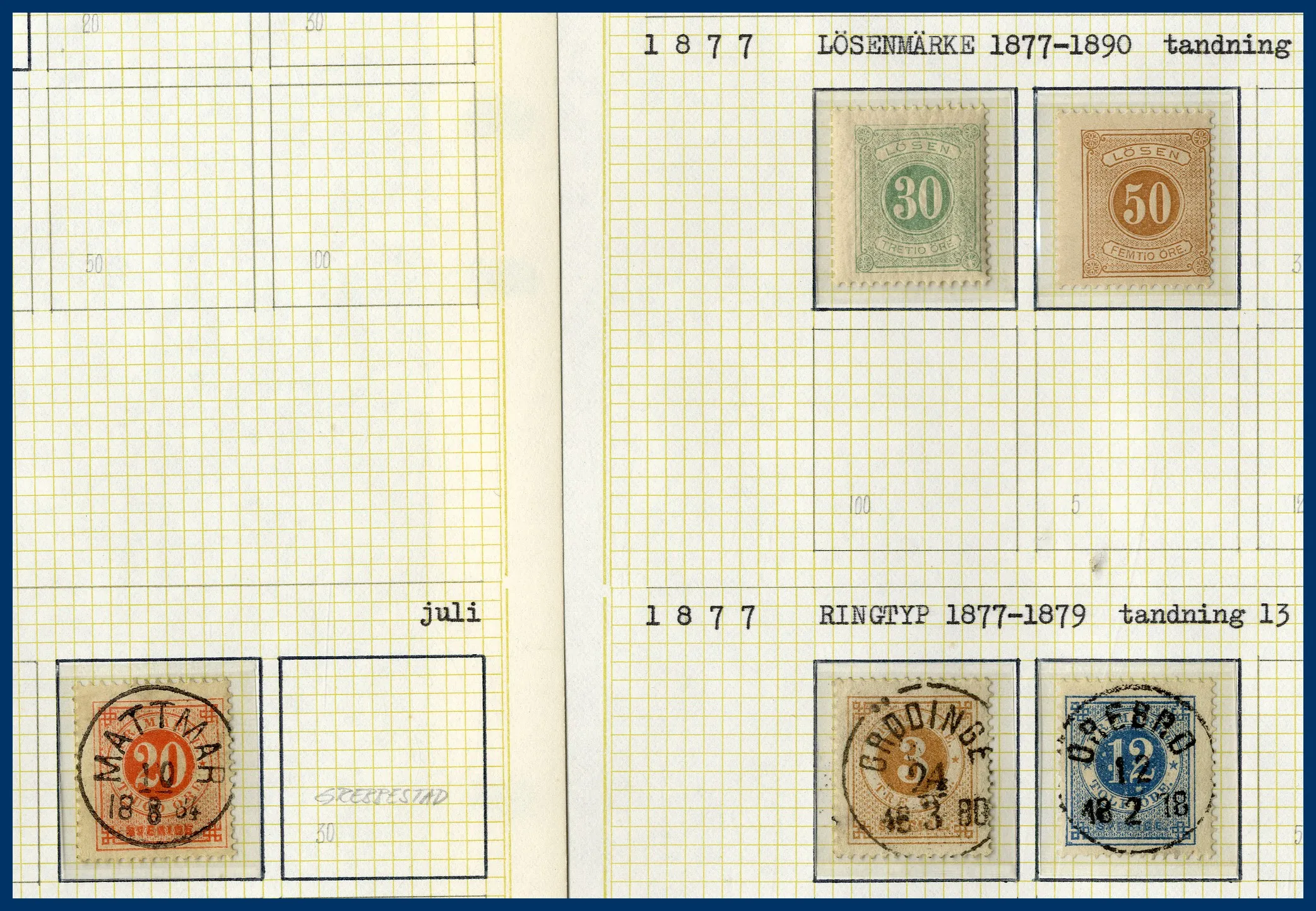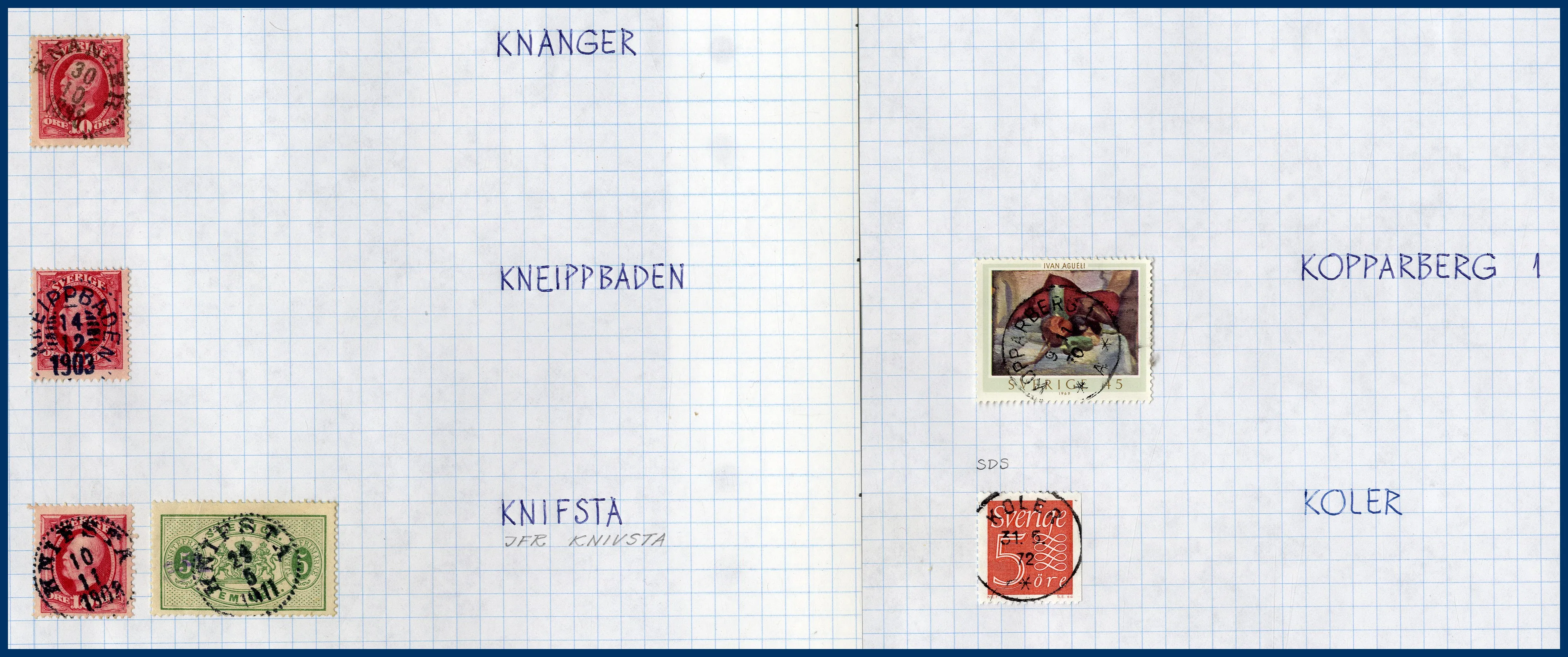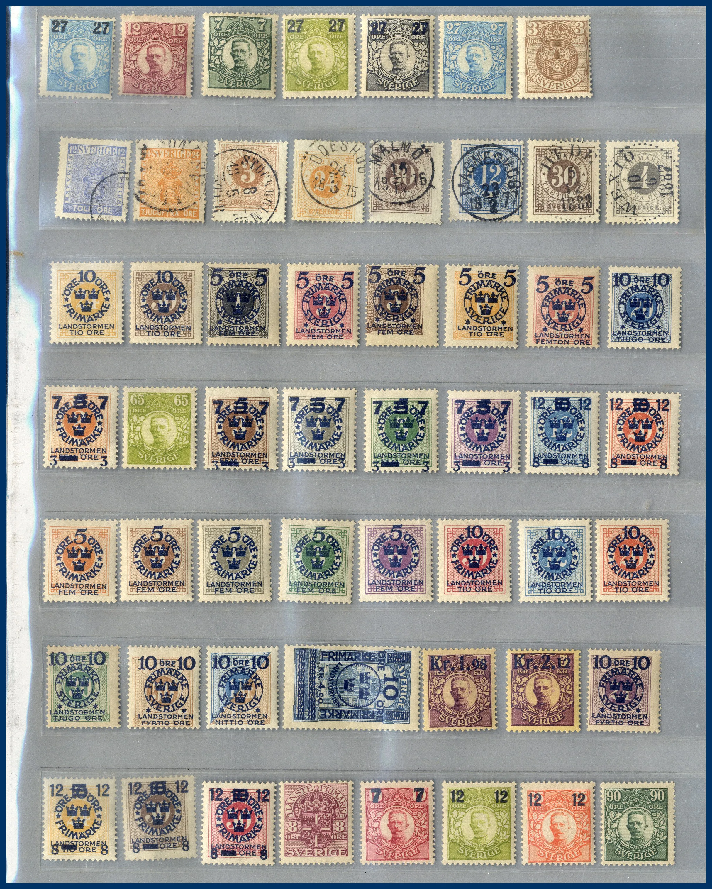 En pärm med en ortstämpelsamling, en samling Sverige 1855 till 1970-talet med bl.a. en 6-skilling, 3 öre Lokal, Slottet och bättre BC-/CB-par. Huvuddelen av samlingen ostämplad med en hel del bättre **. Även snygga stämplar inemellan. Nominal oräknad, men det ingår t.ex. drygt 30 st rabattfrimärken. Även lite frimärken löst i kuvert, en samling julmärken och diverse försändelser. Mycket att gå igenom.