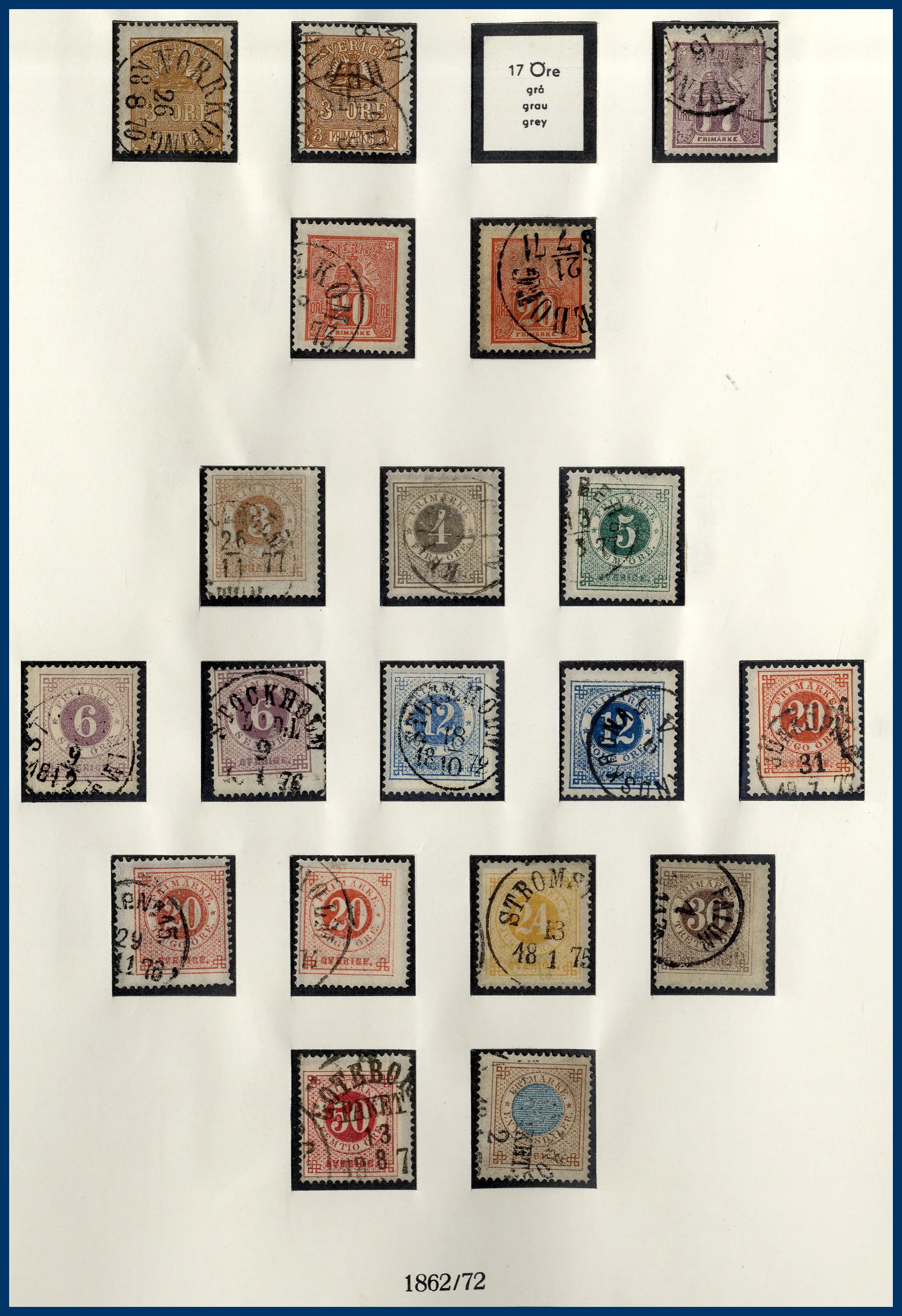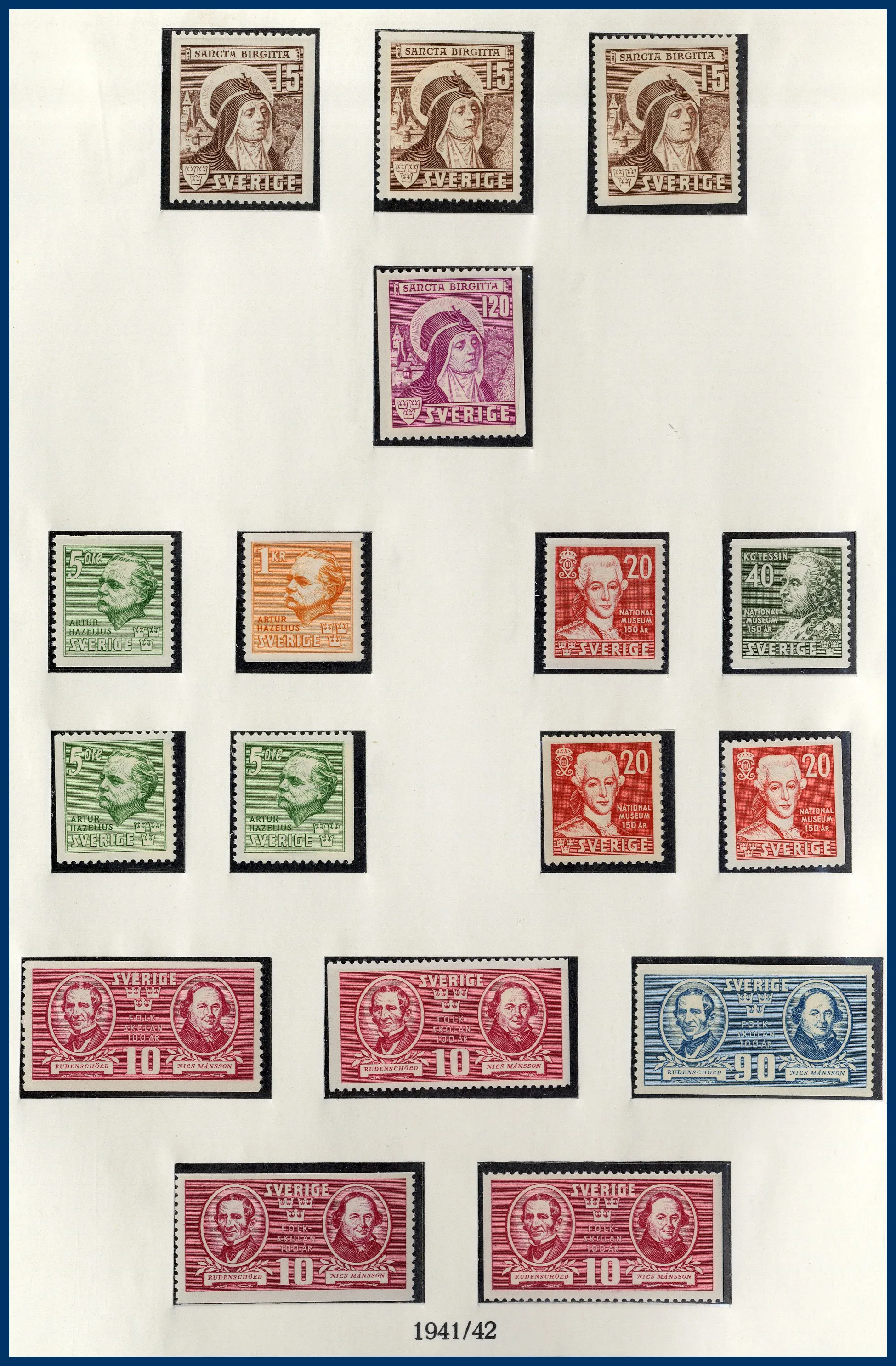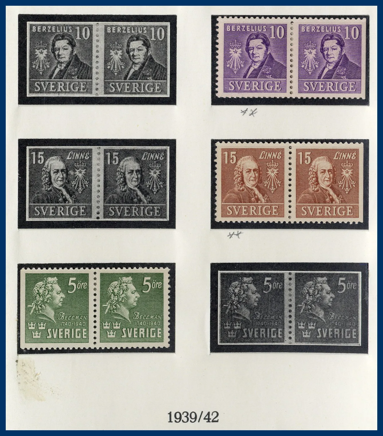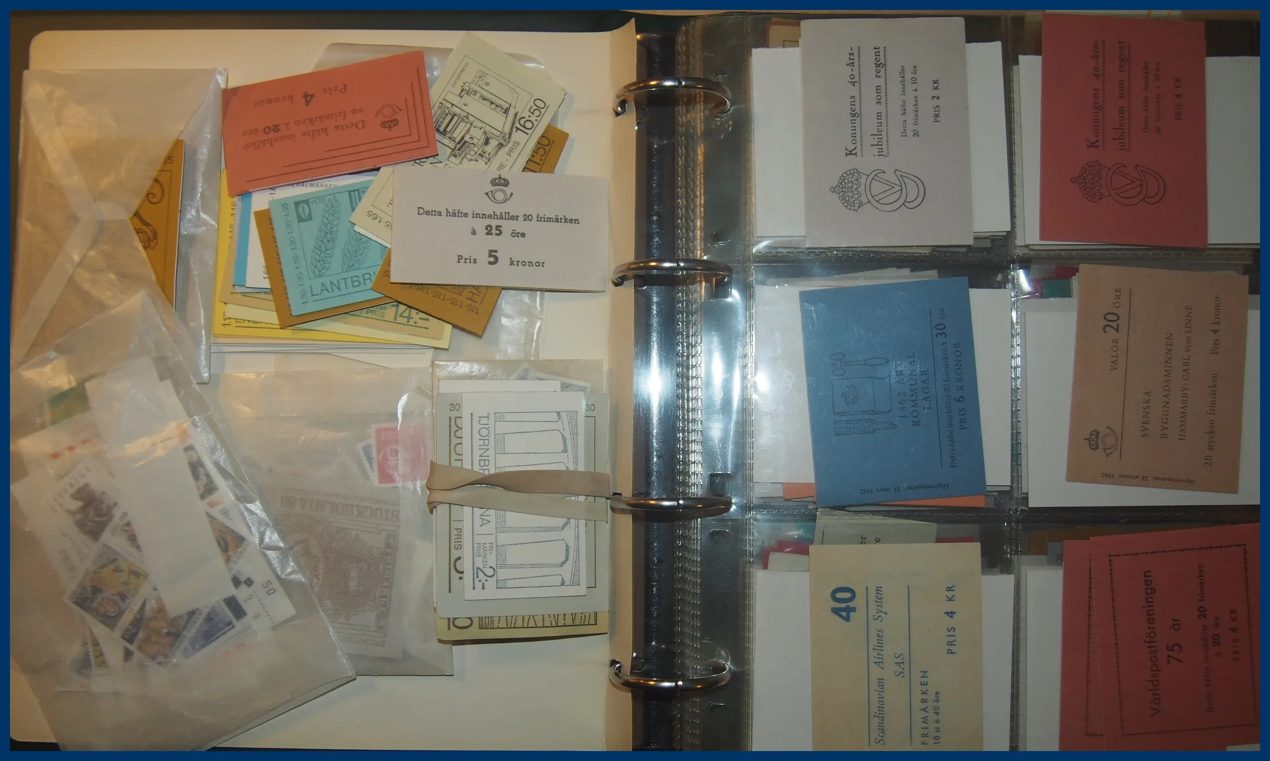 I början stämplat sedan ostämplat **/*, från 1960-talet och framåt idel **. Något blandad kvalitet på de tidigaste märkena. Medföljer också en pärm med häften, äldre till 1970-tal. Nominal i samlingen drygt 3.500 kr (häftena oräknade).