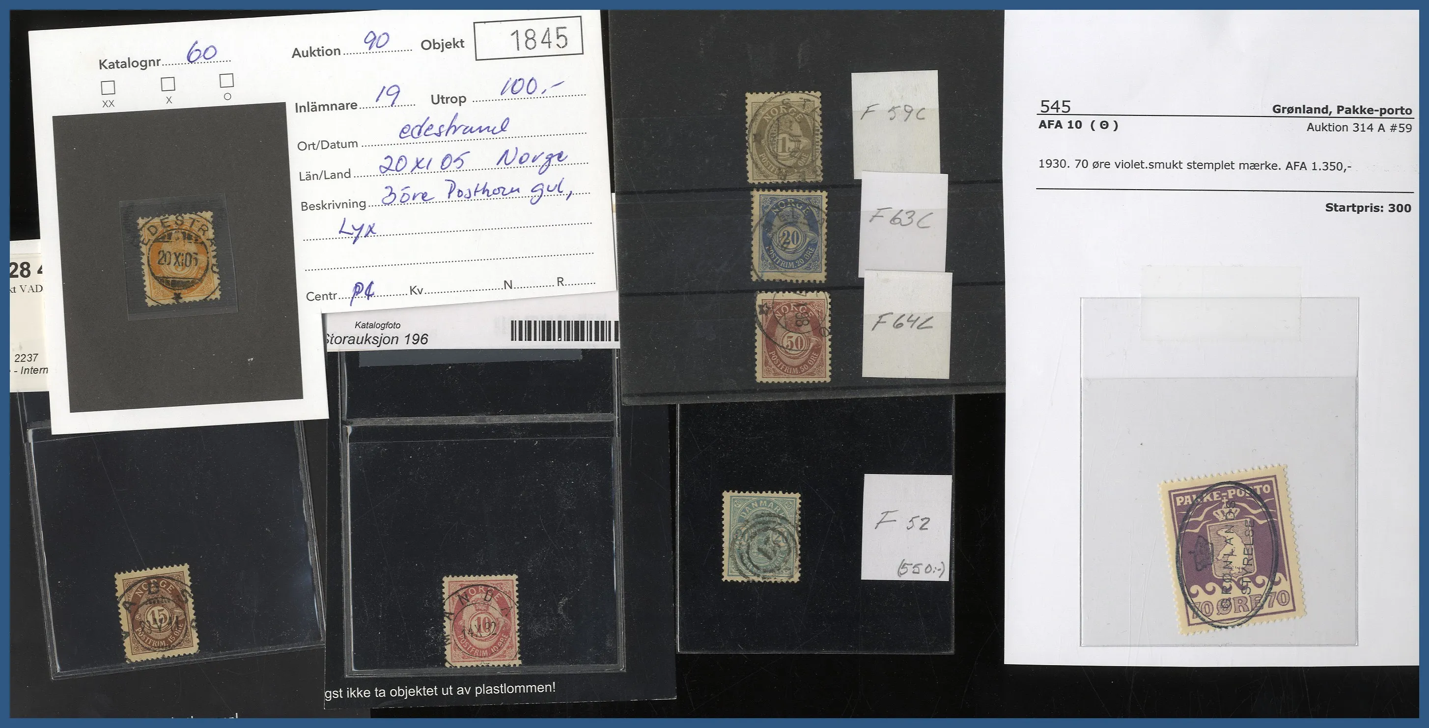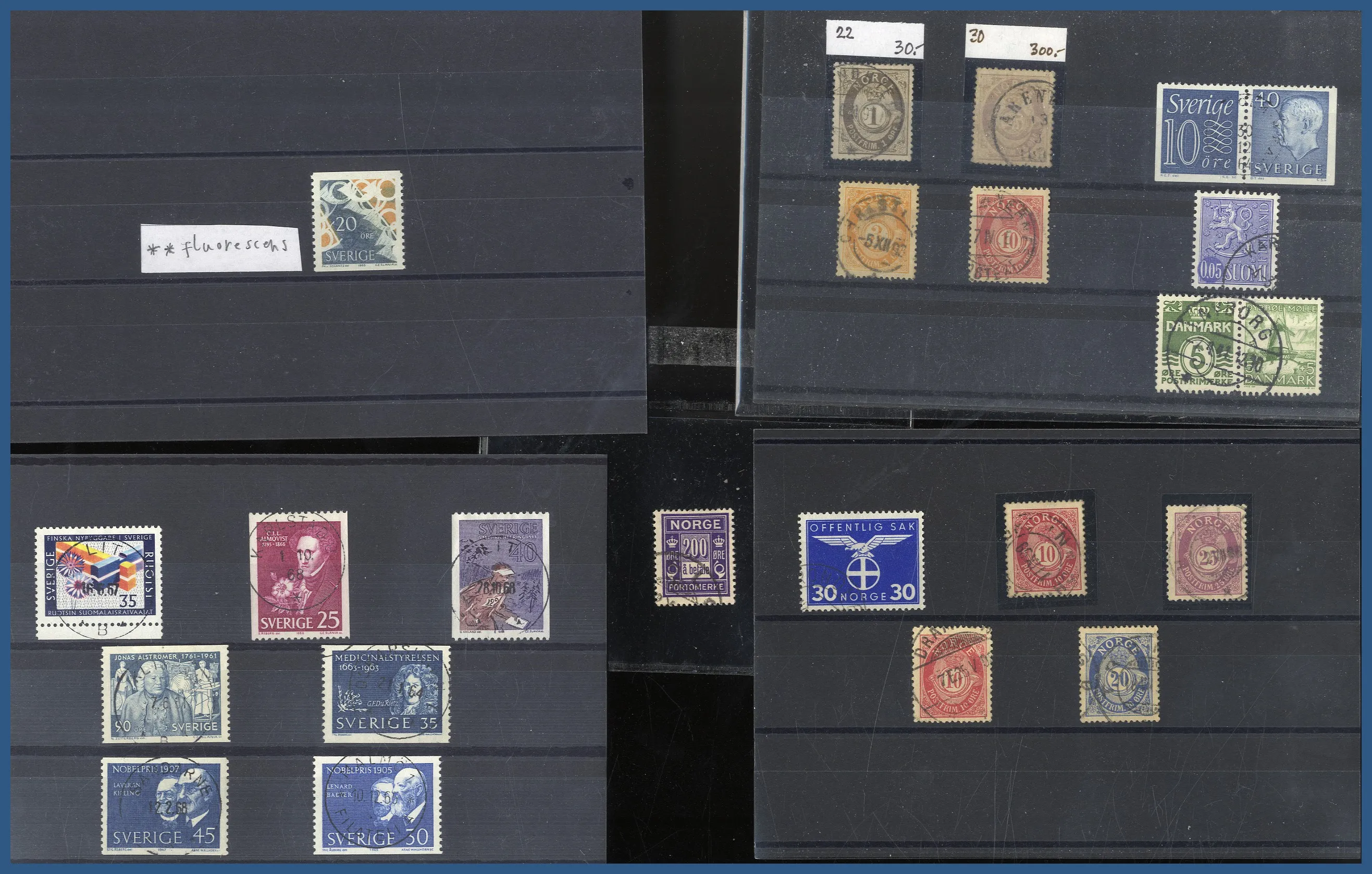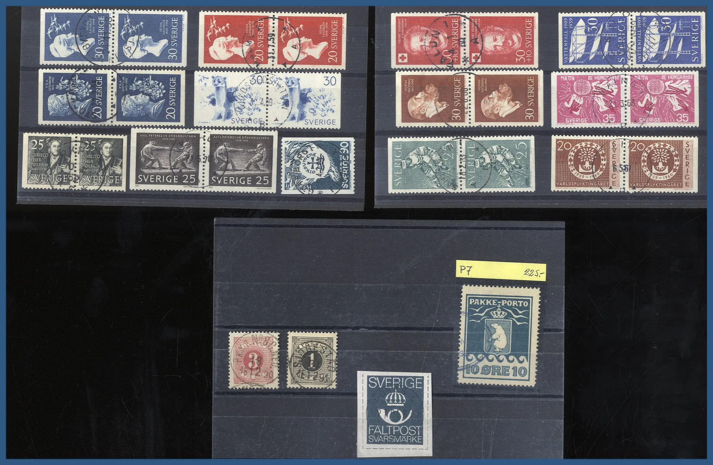 med dels 8 instickskort med ett flertal vackra stämplar på svenska märken samt ett stämplat BC-par Profil höger små siffror, dels ett antal lite bättre nordiska märken (varav många norska posthorn), ofta inköpta som singelobjekt på mindre auktionsfirmor. Lådan innehåller också t.ex. en samling stämplat Finland 1860-1999 i 3 st KABE-album. Relativt glest i början men det finns 7 st stortandade i fantastisk kvalitet samt ett par lite bättre Ryska typer. Fr.o.m. 1941 är samlingen välbesatt. Även ett extra KABE-album med stämplat Finland 1960-1987, ett KABE-album stämplat Norge komplett 1970-1979 samt lite Åland stämplat och ostämplat m.m.