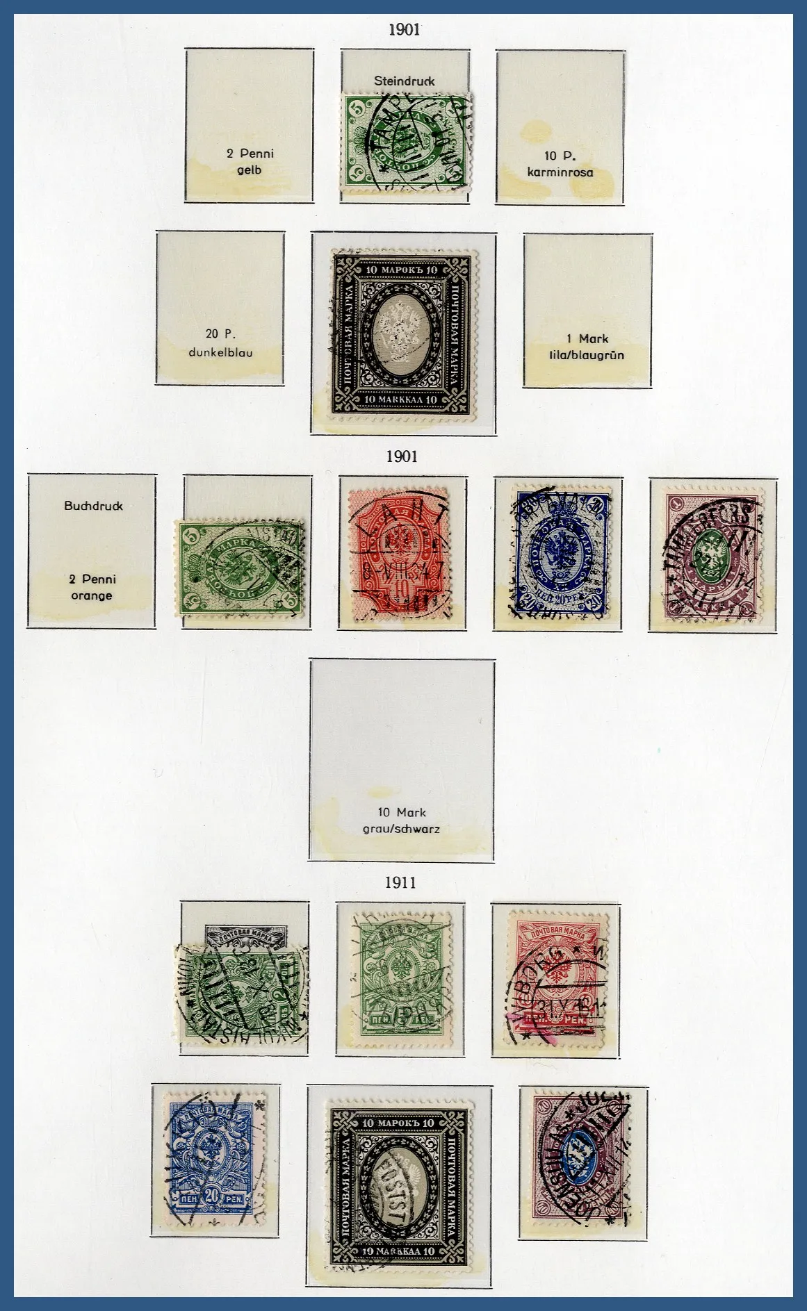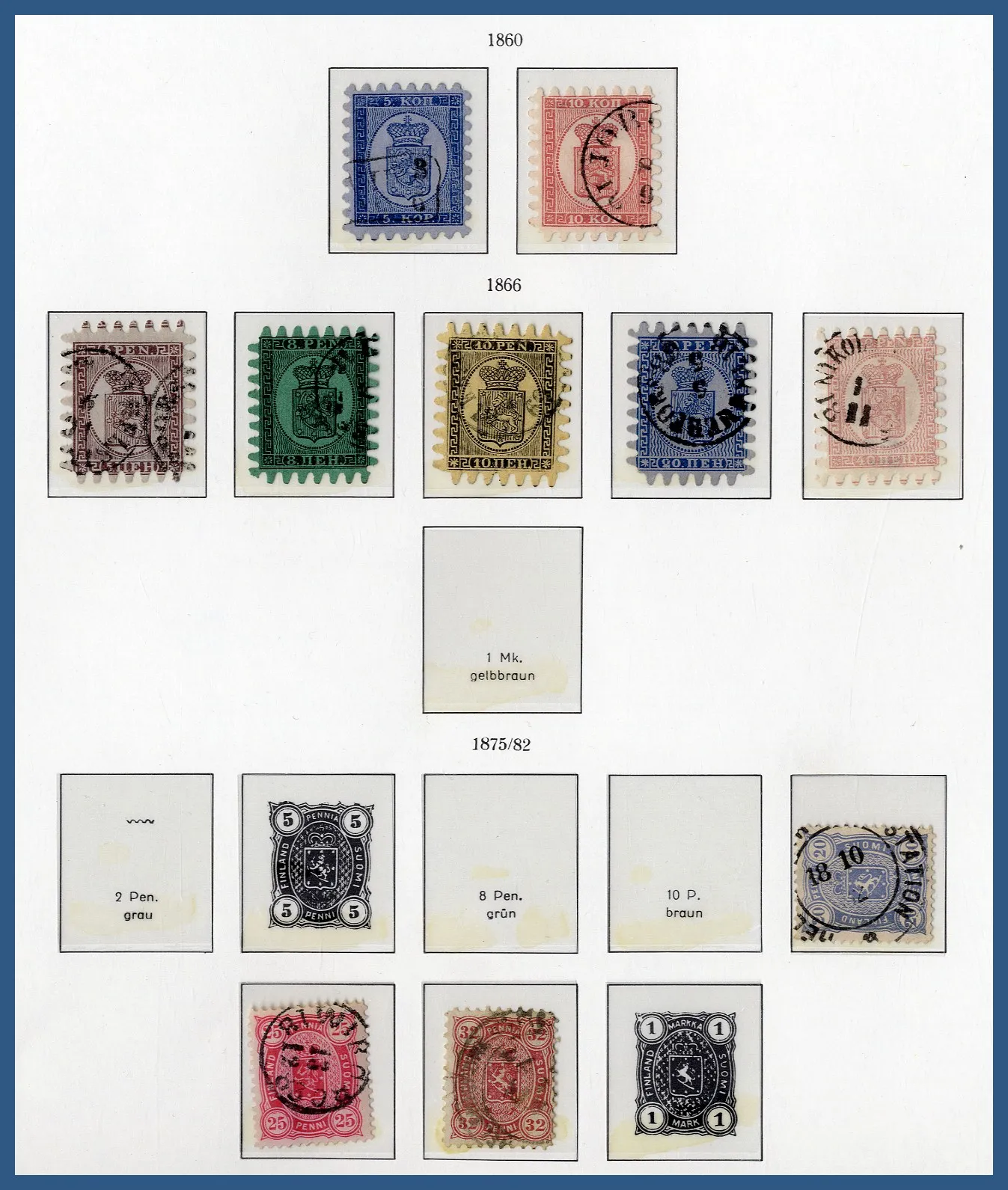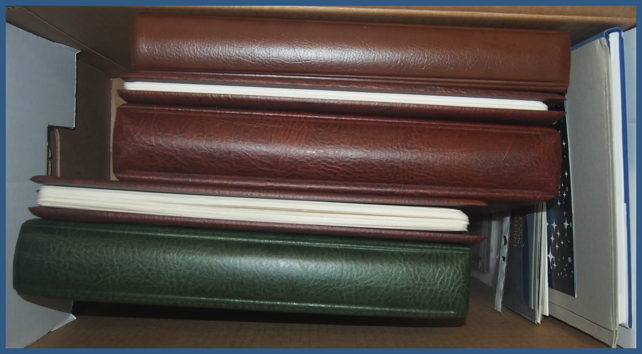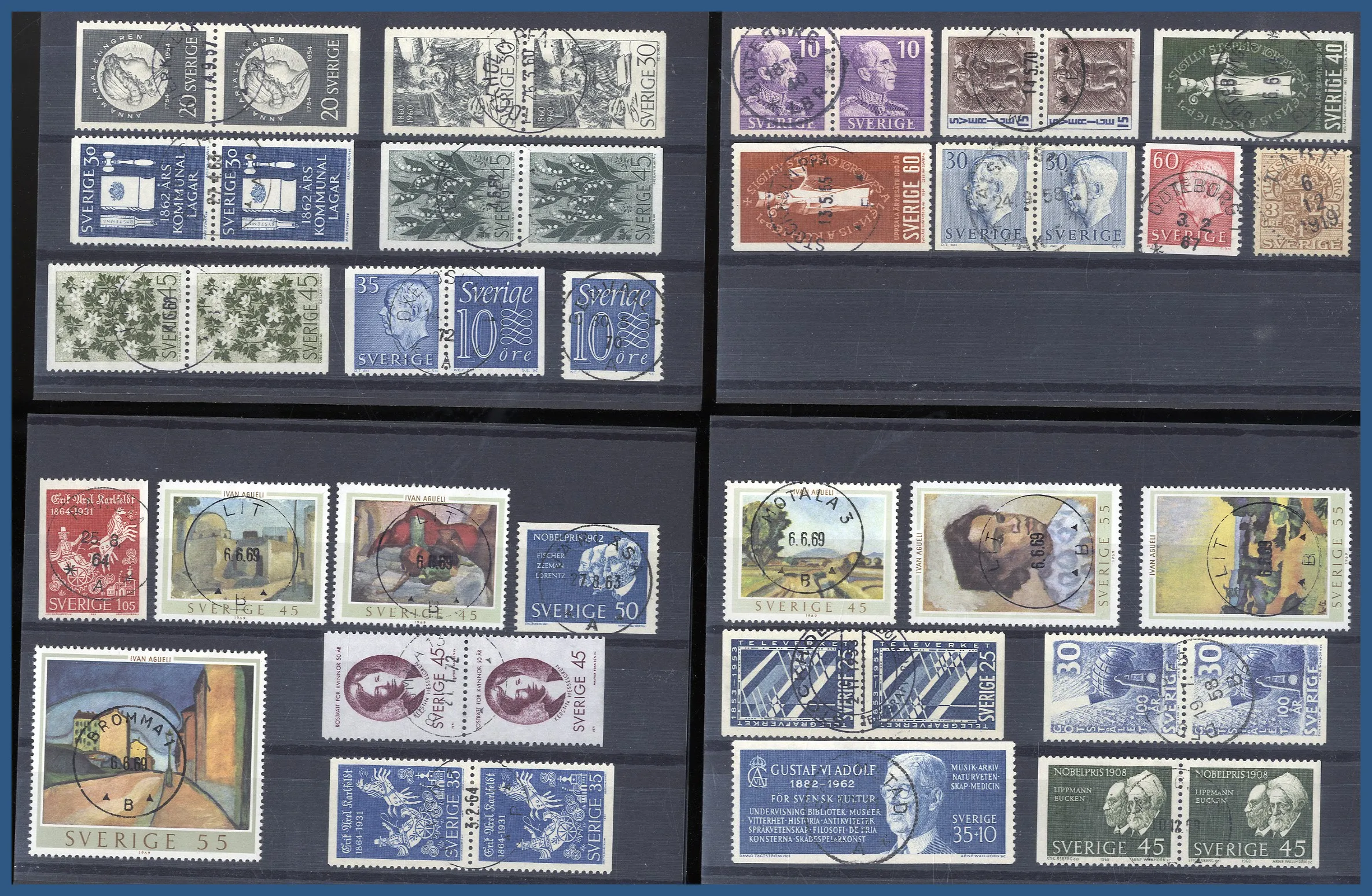 med dels 8 instickskort med ett flertal vackra stämplar på svenska märken samt ett stämplat BC-par Profil höger små siffror, dels ett antal lite bättre nordiska märken (varav många norska posthorn), ofta inköpta som singelobjekt på mindre auktionsfirmor. Lådan innehåller också t.ex. en samling stämplat Finland 1860-1999 i 3 st KABE-album. Relativt glest i början men det finns 7 st stortandade i fantastisk kvalitet samt ett par lite bättre Ryska typer. Fr.o.m. 1941 är samlingen välbesatt. Även ett extra KABE-album med stämplat Finland 1960-1987, ett KABE-album stämplat Norge komplett 1970-1979 samt lite Åland stämplat och ostämplat m.m.