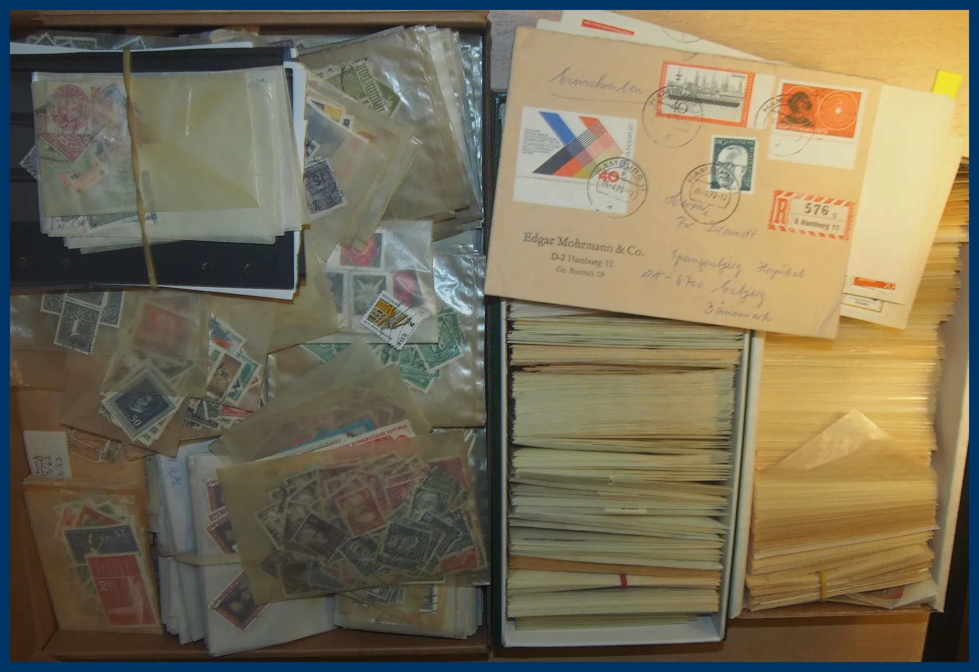 massor av pergamynkuvert med frimärken. Mycket klassiskt och äldre material. Rolig post för den som gillar nyanser, vm, tandningar etc. Övervägande stämplat material. Även en insticksbok med lite Tyskland och andra länder.