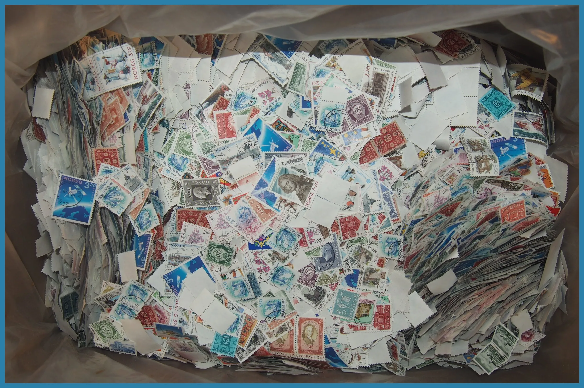 66. (FF) 10,5 kg tvättade osorterade frimärken från Norge.
