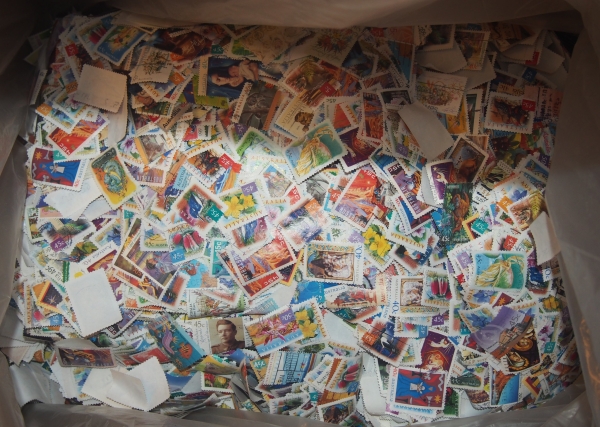 45. (FF) Drygt 10 kg tvättade osorterade frimärken från