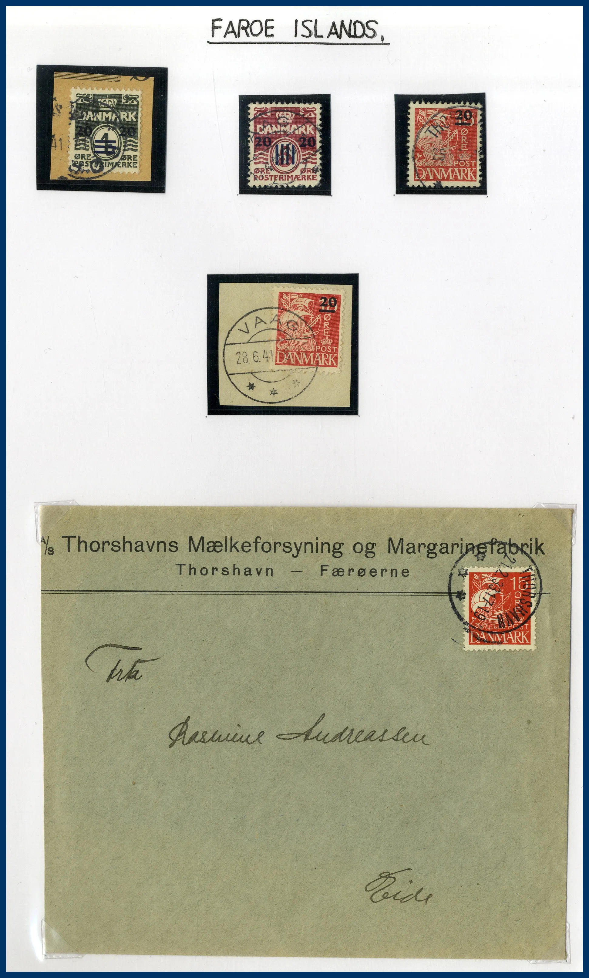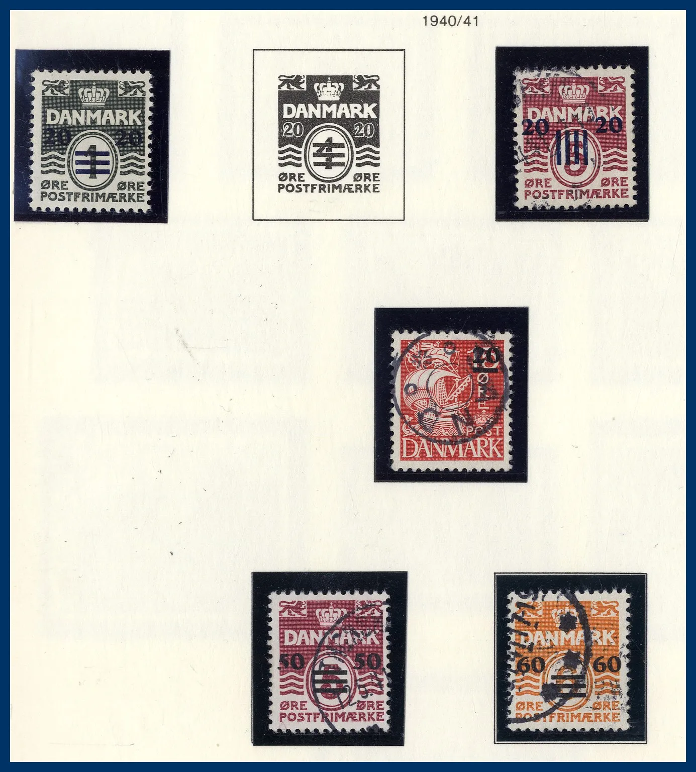 1940-2014 till synes komplett förutom två av de tidiga märkena med påtryck på danska märken, en samling O/**/* 1940-2016 med en del luckor, ett album ** fyrblock och FDC, en samling O/**/* 1940-2023 (långt ifrån komplett), ett album årssatser 1975-1997 samt två insticksalbum med ** marginalfyrblock.