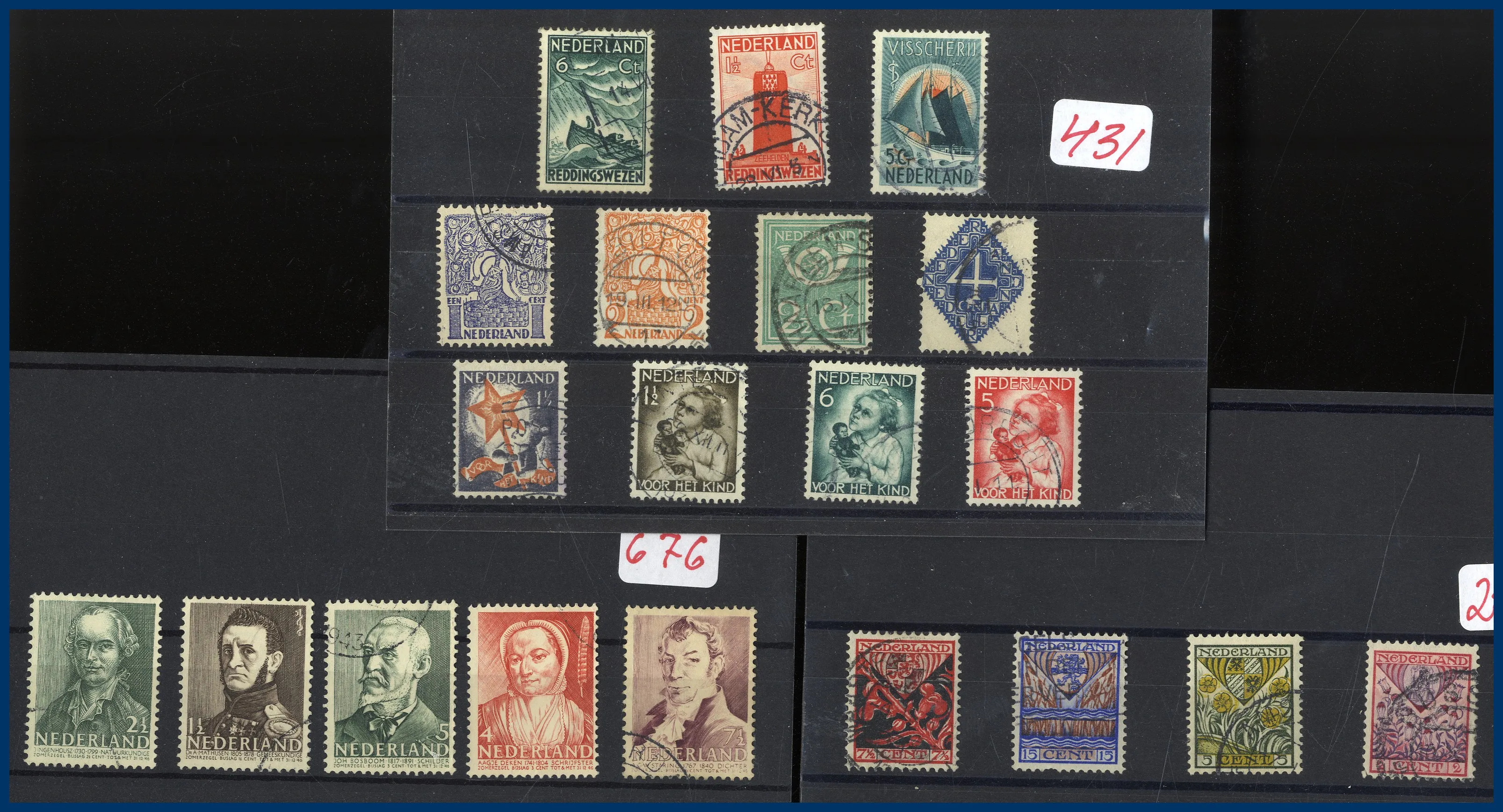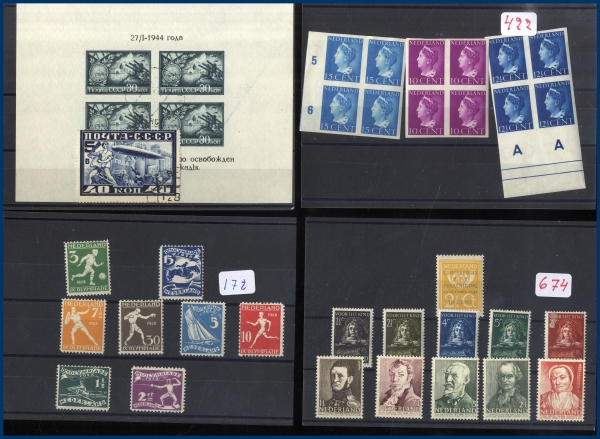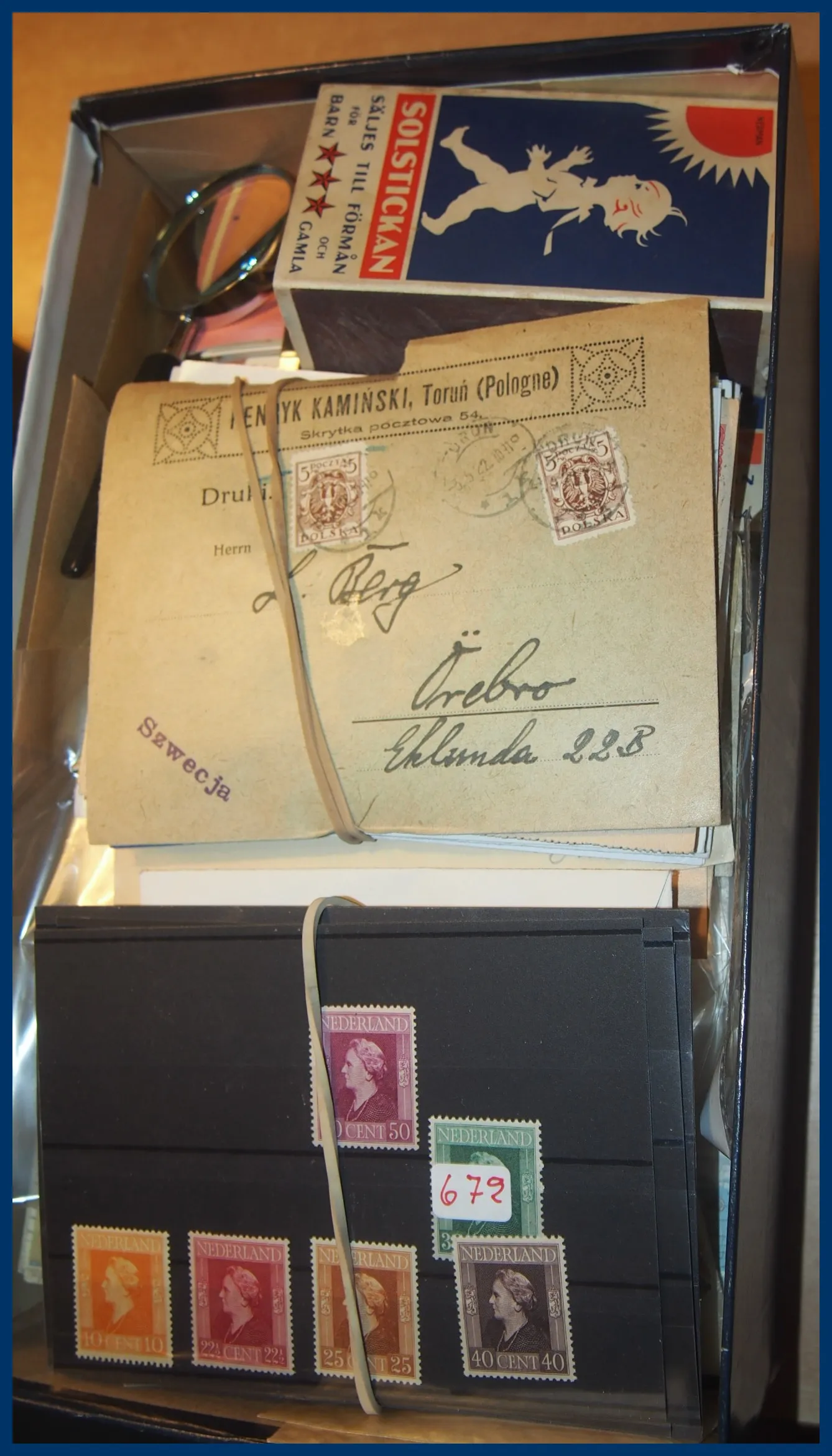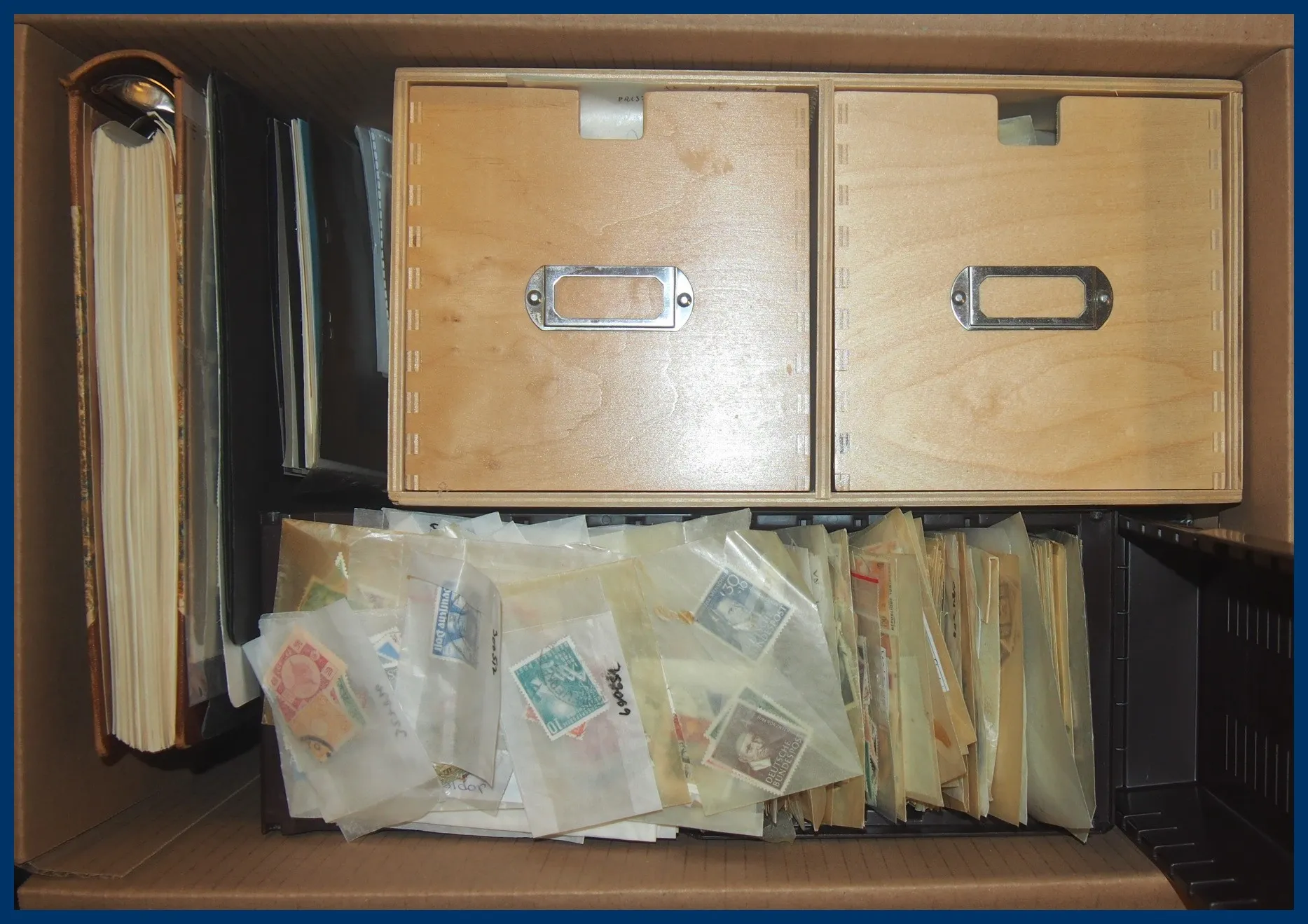 äldre till halvmodernt. Även en liten bunt med frimärken på instickskort och en trevligt monterad temasamling med svenska frimärken i album. I trälådan är det Danmark och Finland i kuvert. Sammanfattningsvis mycket att rota igenom.