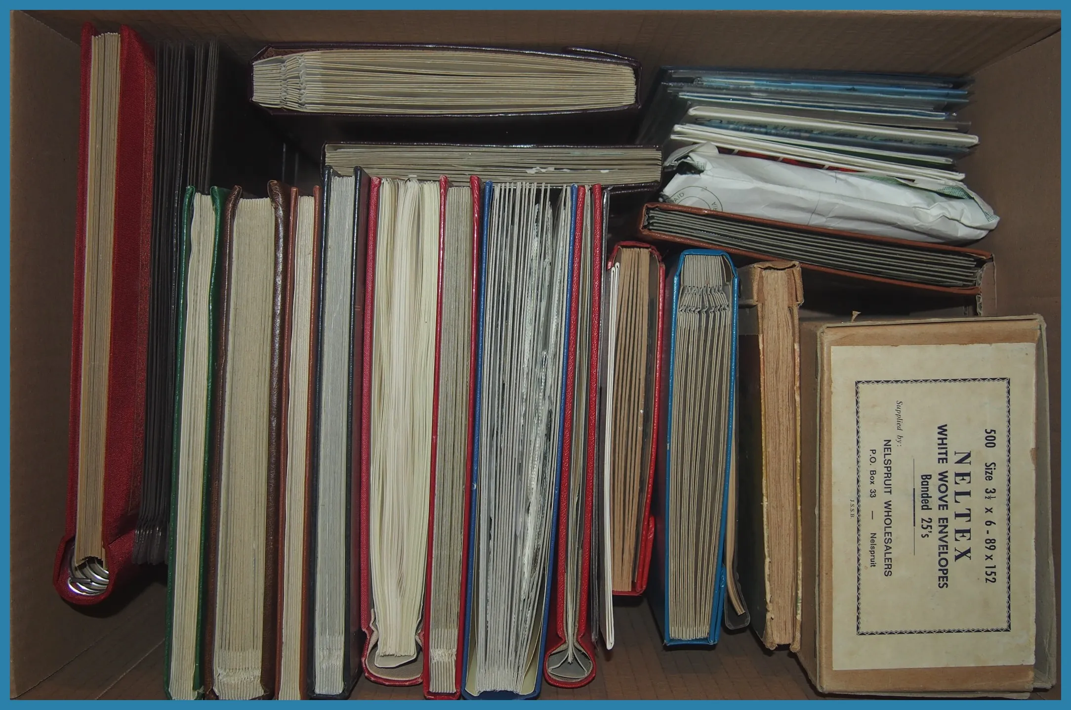 mängder av lösa märken i låda, även kuvert med ca 80 st paketadressavier med mest svensk frankering sända till Sydafrika på 1970-80 talet. Sverige stämplade dubbletter Oscar II-2014 samt ** mest 1970-1980 talet Nominal ca 1.750 kr.