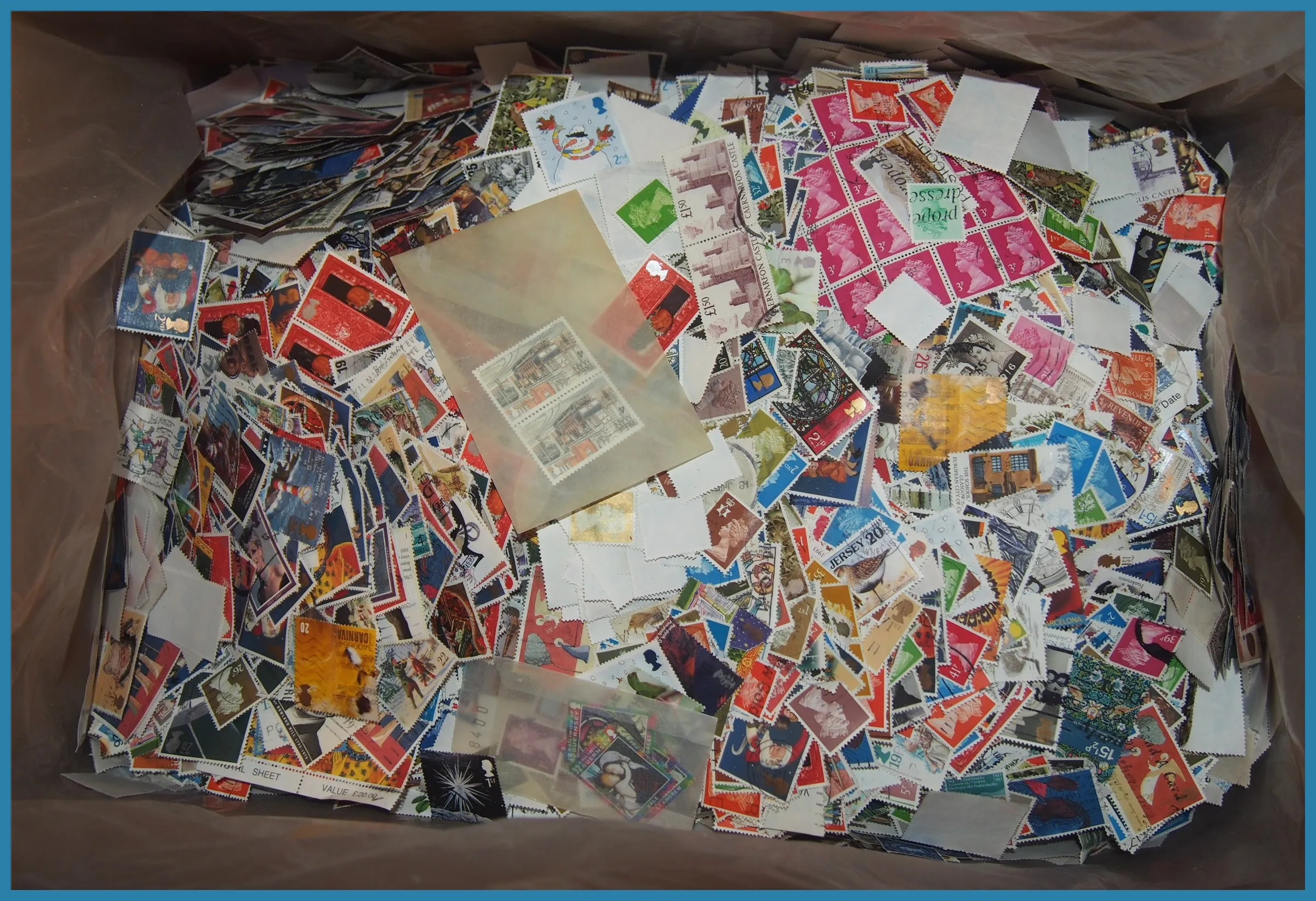63. (FF) Närmare 9 kg tvättade osorterade frimärken från