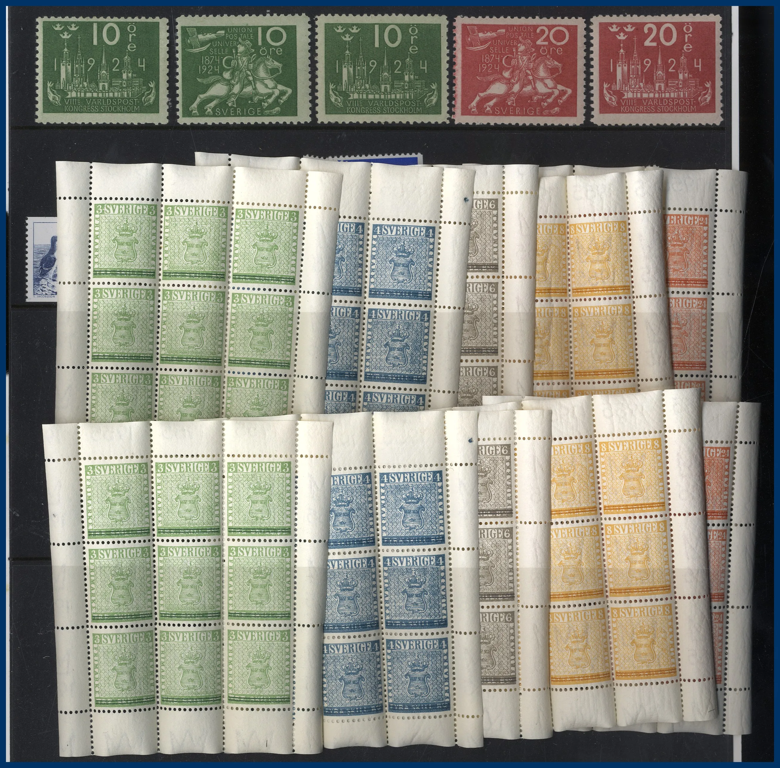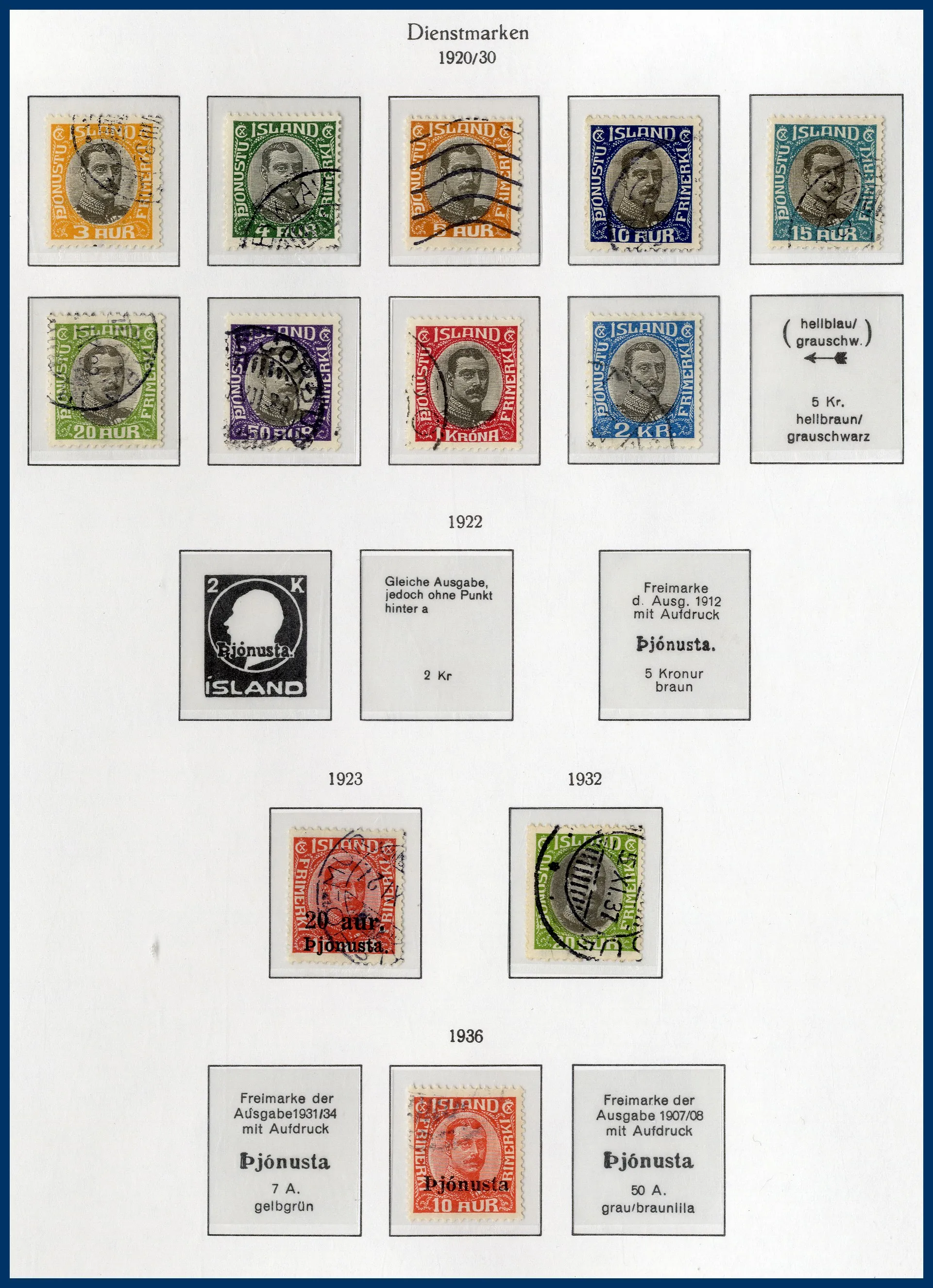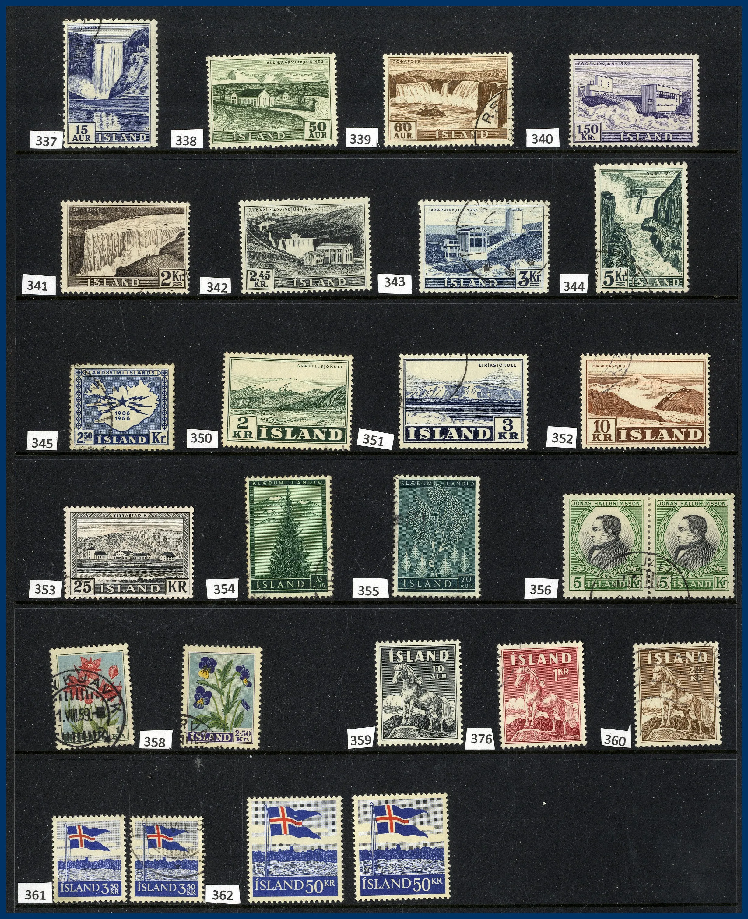 mängd **/*, mest 1940-1970-talet, i ett tjockt visiralbum, ett tjockt insticksalbum, på Postens insticksblad samt i pergamynkuvert. Även drygt 100 svenska vinjett-FDC från 1950-1970-talet samt bunt med andra typer av försändelser. Island med två välbesatta stämplade samlingar, båda från 1940-1990-talet. Den ena samlingen är monterad i 2 st KABE-album medan den andra sitter på visirblad.
