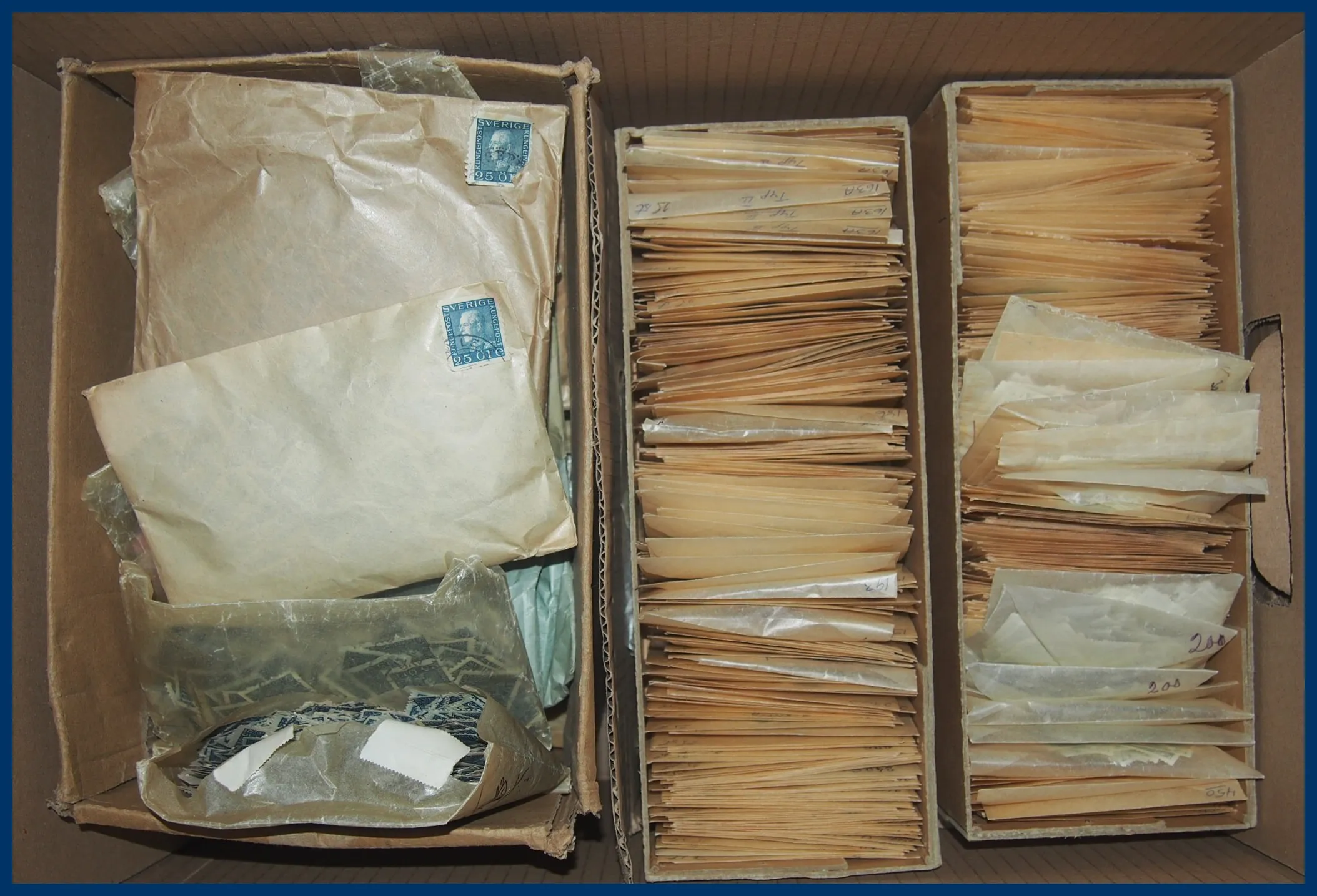 470. (FF) Stor flyttlåda med svensk massvara i pergamynkuvert.