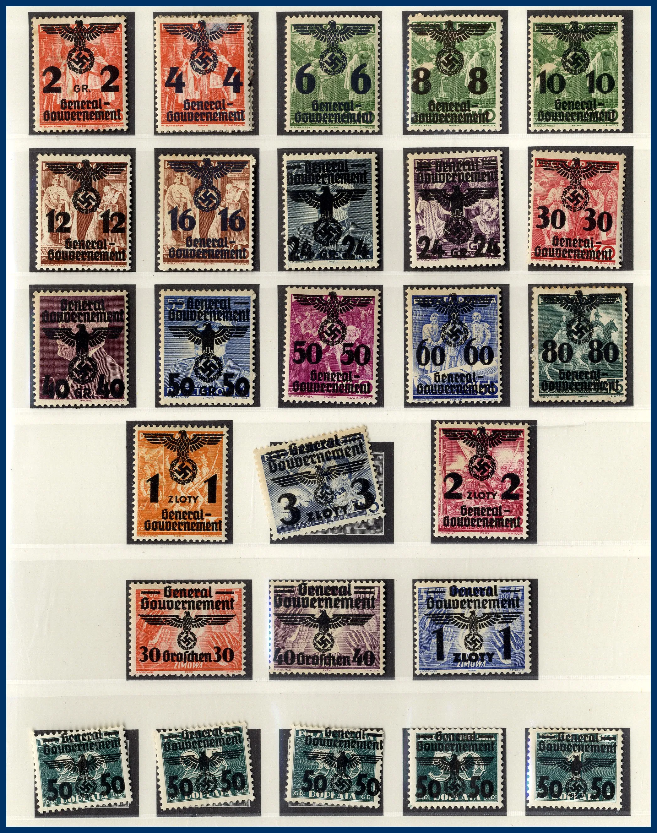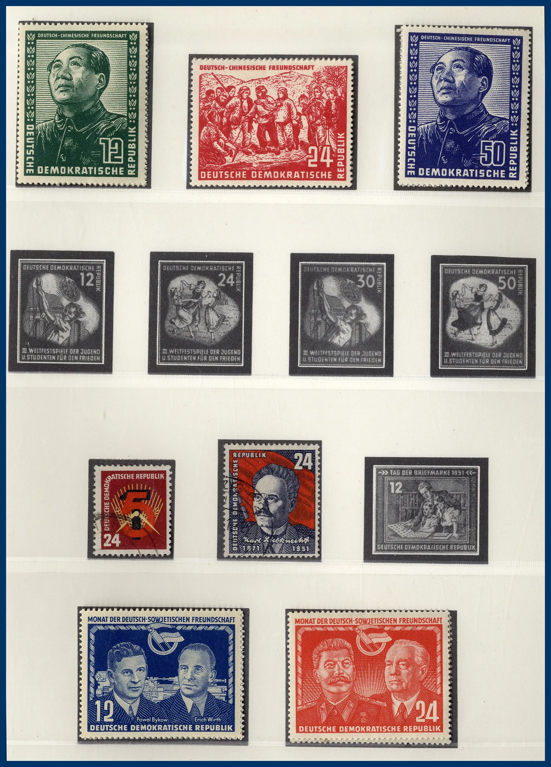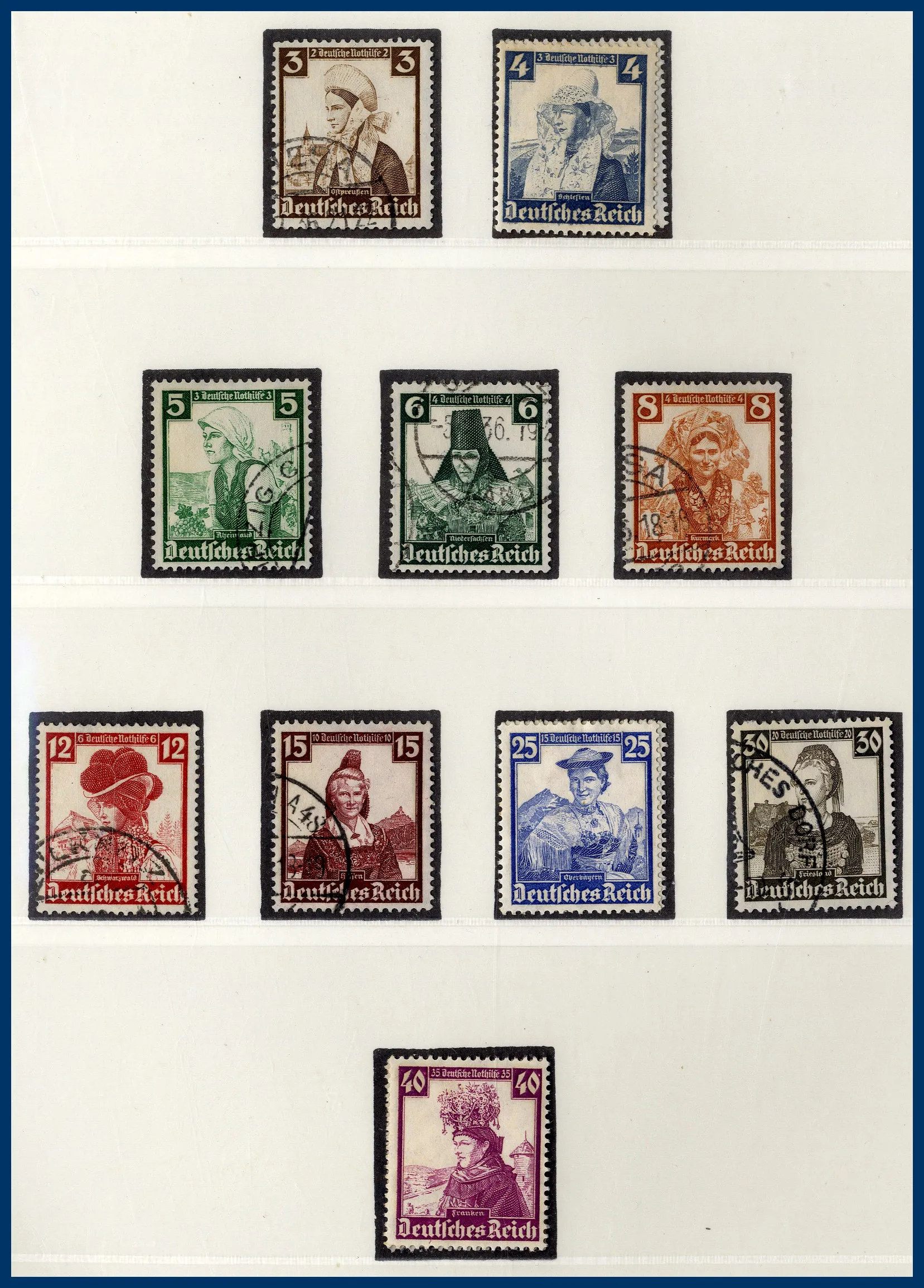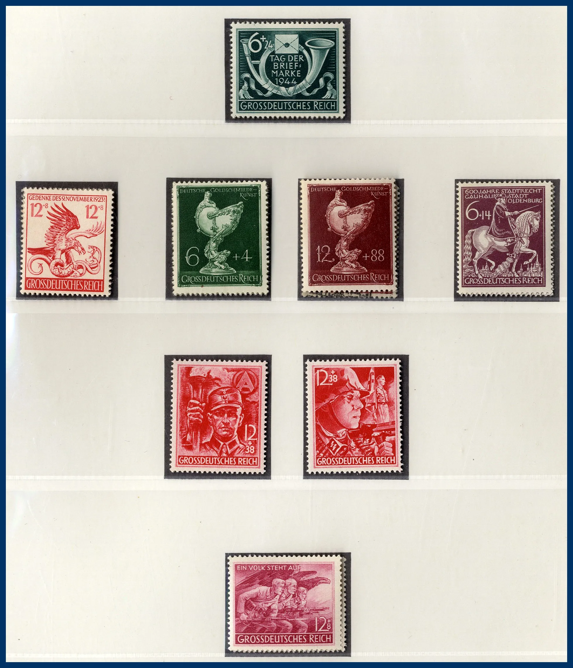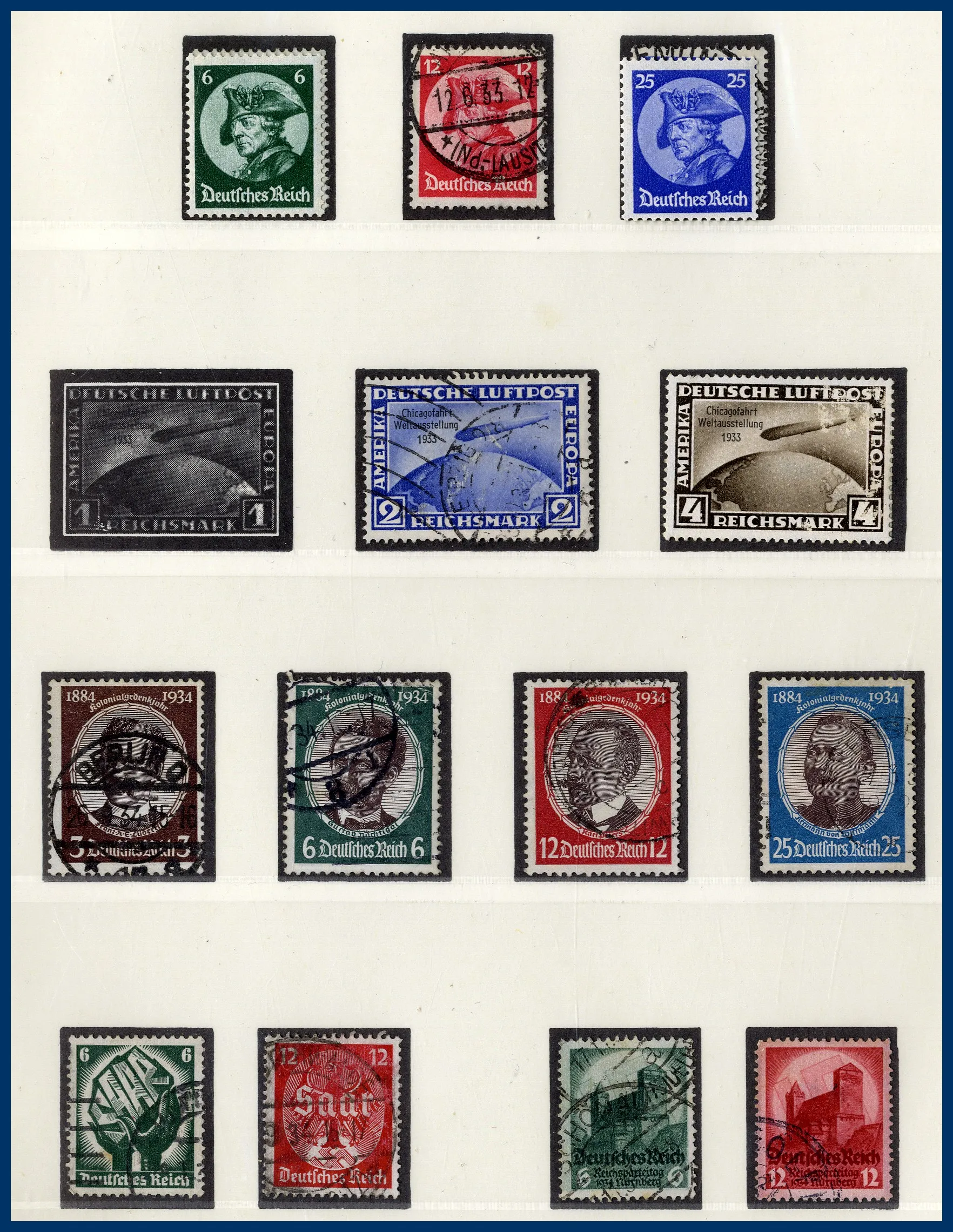 Falzlos-album och 2 tjockare insticksalbum. Österrike från klassiskt fram till 1978. Tyskland med flera områden O/**/*, bl a Tredje riket-samling med t.ex. 2 M Chicagofahrt stämplad, kolonier, besittningar, olika zoner efter 1945, DDR, SAAR mm. Mycket att gå igenom och lite bättre har setts här och där. Rolig post.