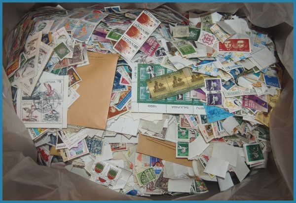 frimärken från forna Östeuropa. Mest från Tjeckoslovakien, därefter Ryssland/Sovjet, sedan Jugoslavien och Bulgarien. Även lite från Slovakien, Lettland och Litauen. Inemellan pergamynkuvert med ostämplade märken från de respektive länderna. Frimärkenas nettovikt 7-8 kg.
