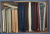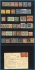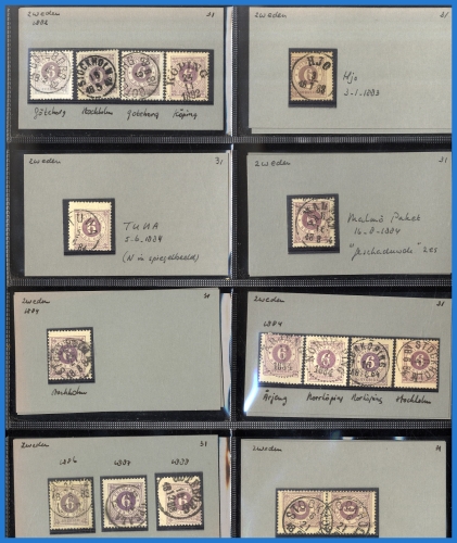 till bandmärken i 13 album, varav flera visir. En hel del Vapentyp, mycket Ringtyp, Oscar, Medaljong, bandmärken samt stora och små tjänste. Flera av albumen innehåller stämpelsamlingar sorterade efter normalstämpeltyp och det finns ett även ett välfyllt album järnvägsstämplar. Blandad märkes- och stämpelkvalitet. I lådan finns också lite Sverige **/* 1950- till 1970-talet på lösblad, en plastficka Tyska riket samt lite litteratur. Lådan väger drygt 20 kg.