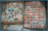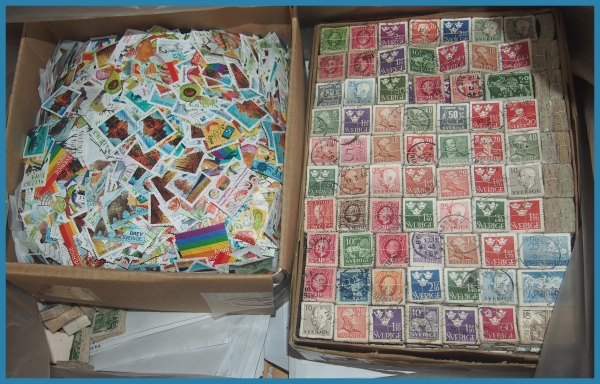 lådan innehåller C6-kuvert med dubbletter sorterade efter utgåva, medan resten av lådinnehållet består av buntar och tvättade osorterade märken.