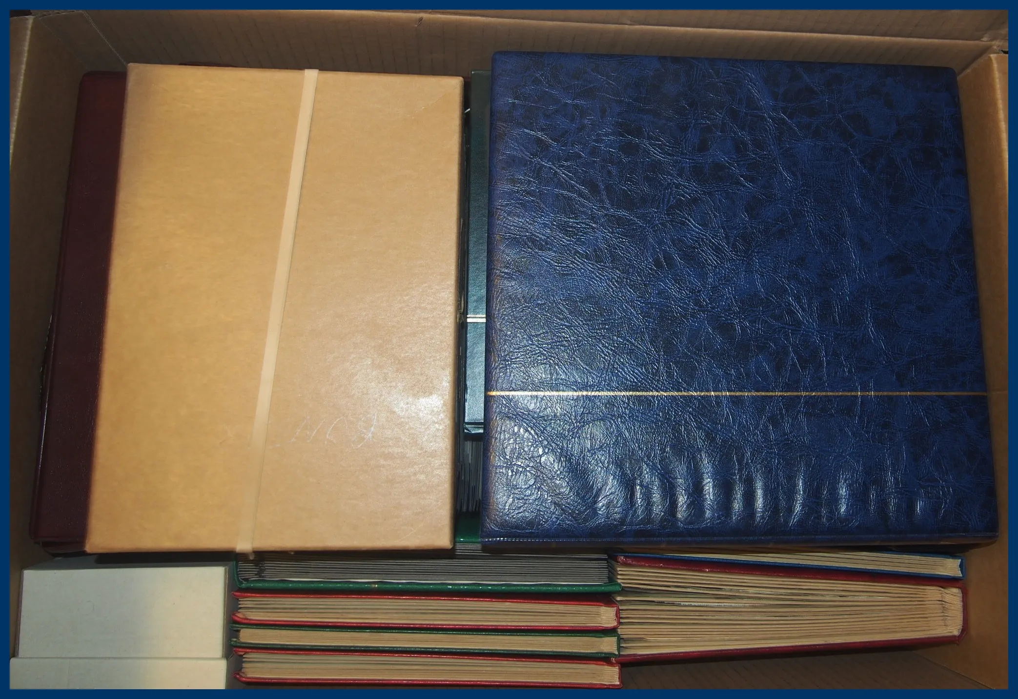samling **/* 1971-2000 i två förtrycksalbum, relativt välbesatt. Även ett visiralbum och 8 insticksalbum stämplat klassiskt till 2008, två kartonger med lösa märken och märken i pergamynkuvert (här finns även lite Irland) samt 10 album med FDC från främst Storbritannien men även andra länder inom samväldet. Lådan väger 32 kg, bör hämtas.
