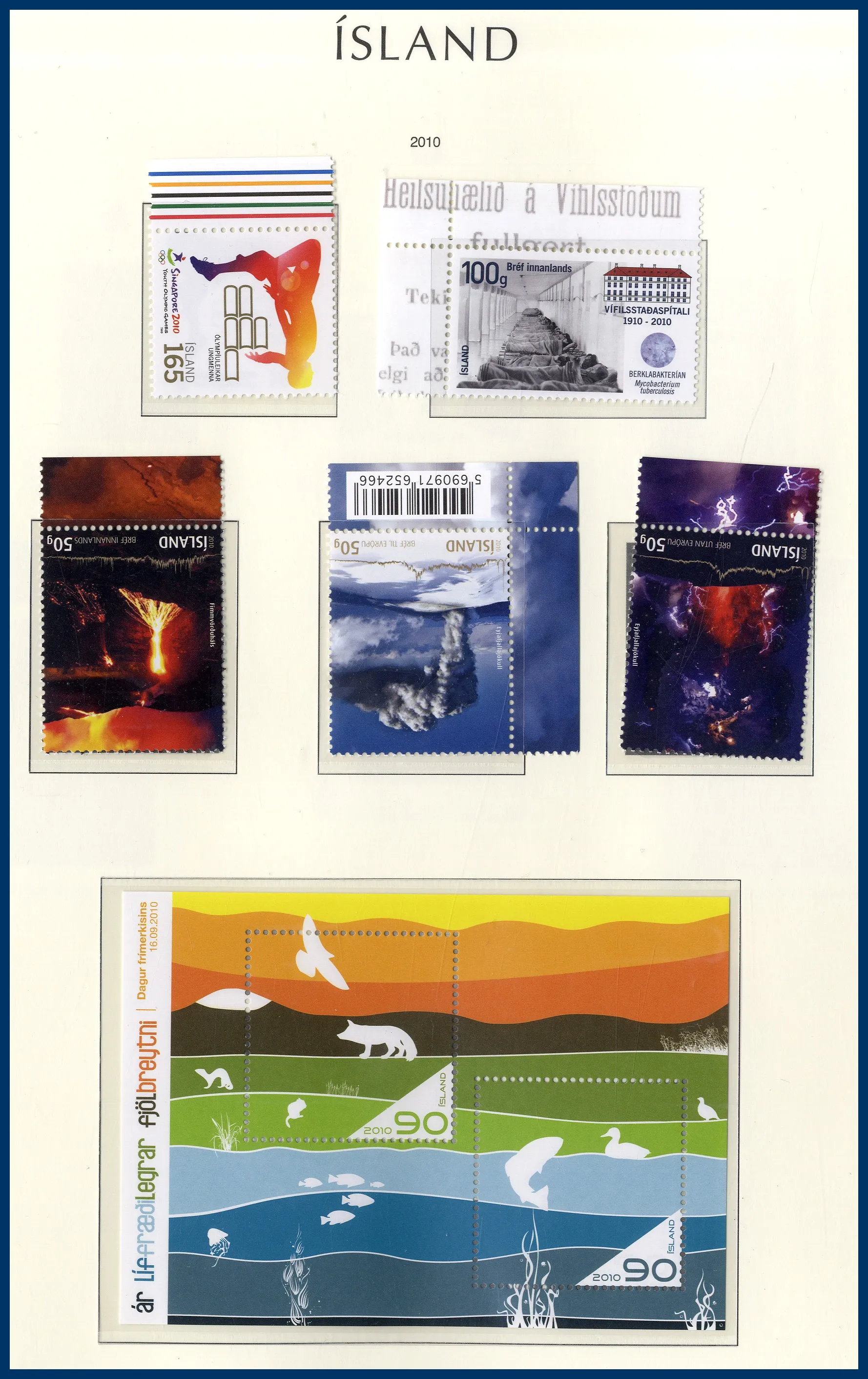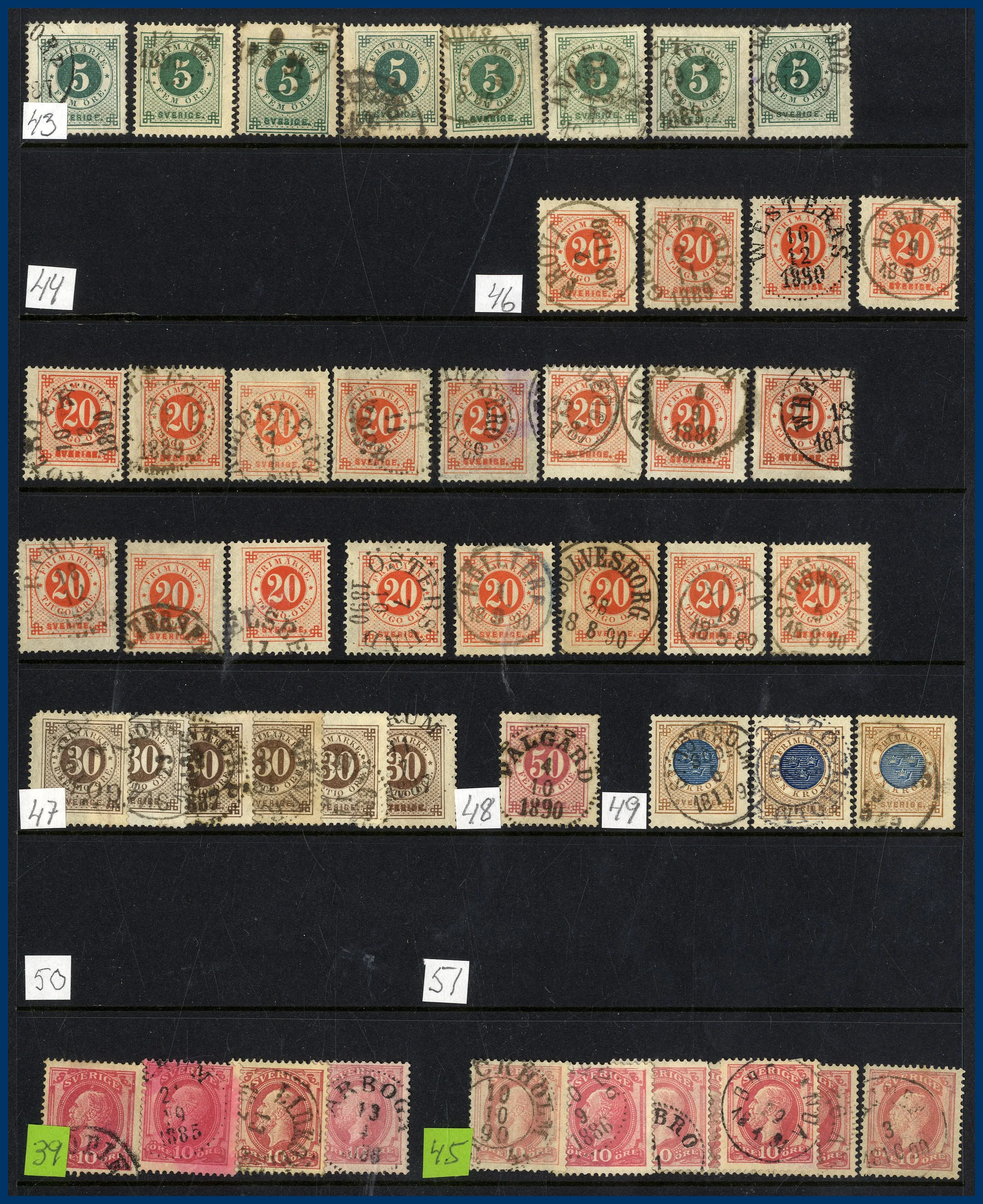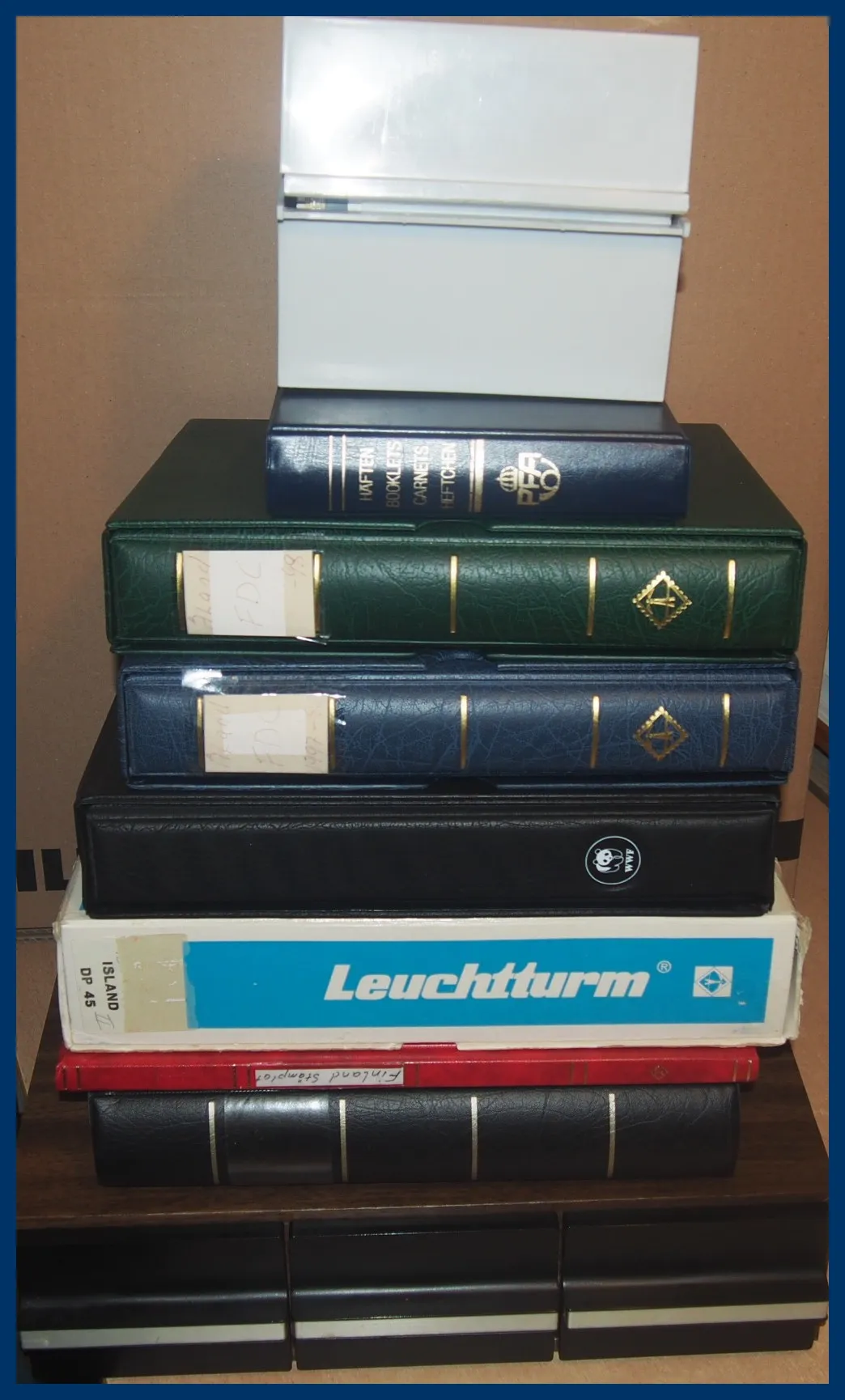 Kassett med 3 lådor för pergamynkuvert med frimärken och svenska mjuka häften 1950- till 1980-talet samt automathäften. Ett Leuchtturmalbum med blad för Island 2000-2010, drygt halvfullt. Insticksbok med liten samling Finland. Visiralbum med lager Sverige Ringtyp och framåt. Ett album WWF med vackra djurmotiv. En plastbox med vykort, ett häftesalbum med svenska häften och en Åland FDC-samling i två fina album. Svensk nominal minst 5.500 kr (ej räknat 50-60-70-tal).