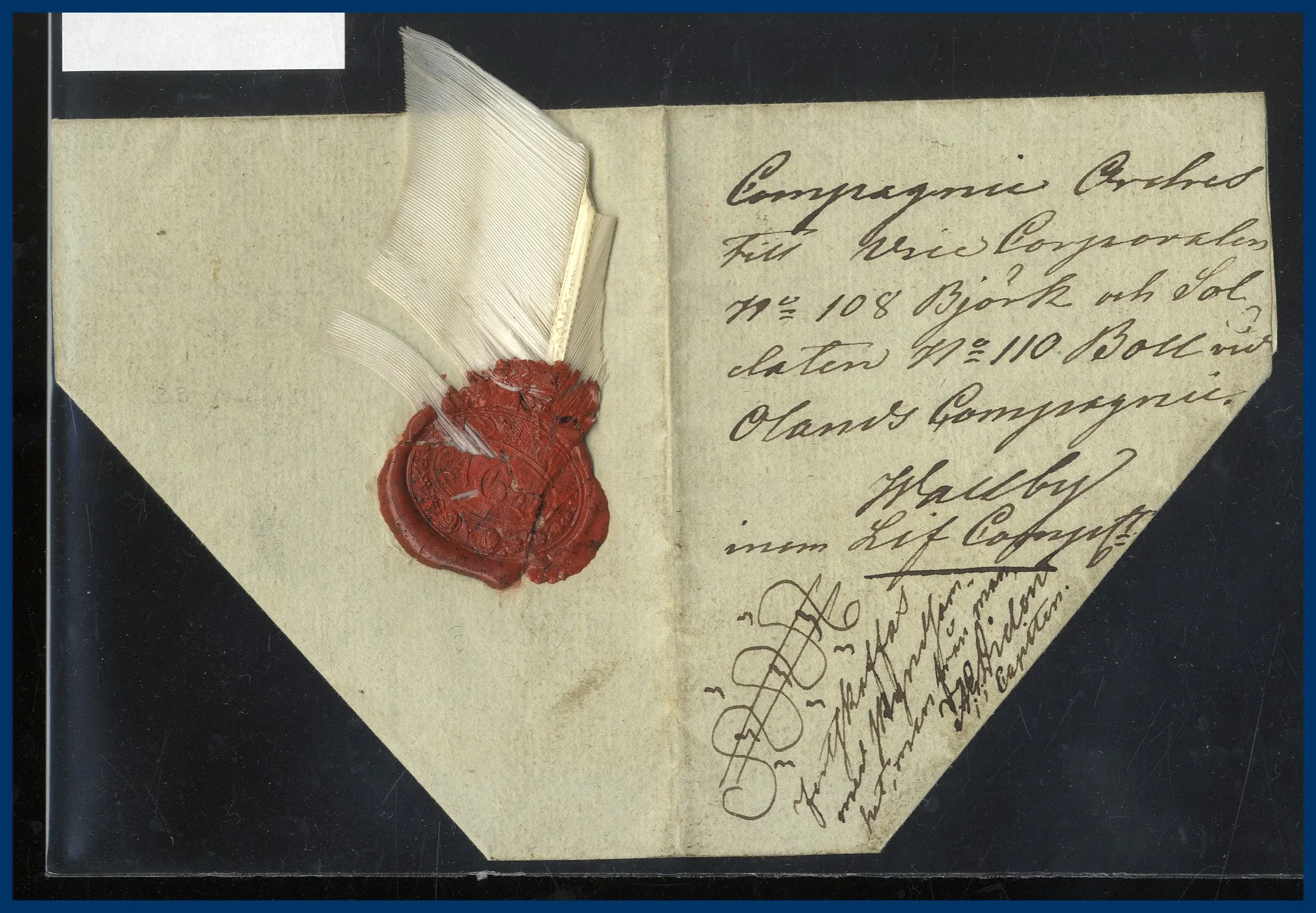 brev adresserat till Corporalen no 108 Björk och Soldaten No 110 Boll vid Olands Compagnie i Wallby. Innehåll daterat 23 juli 1838. Vacker Meanderslinga.
