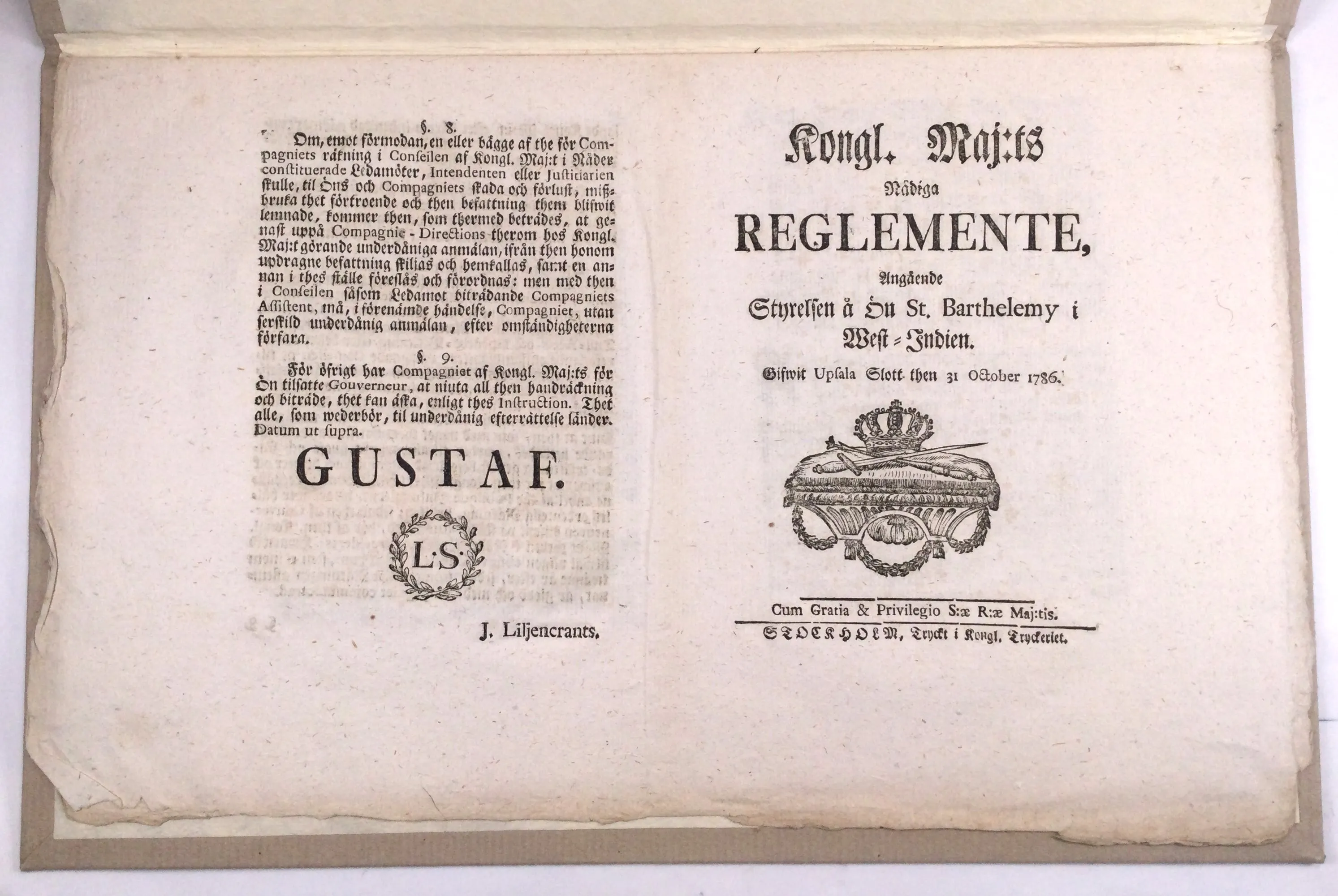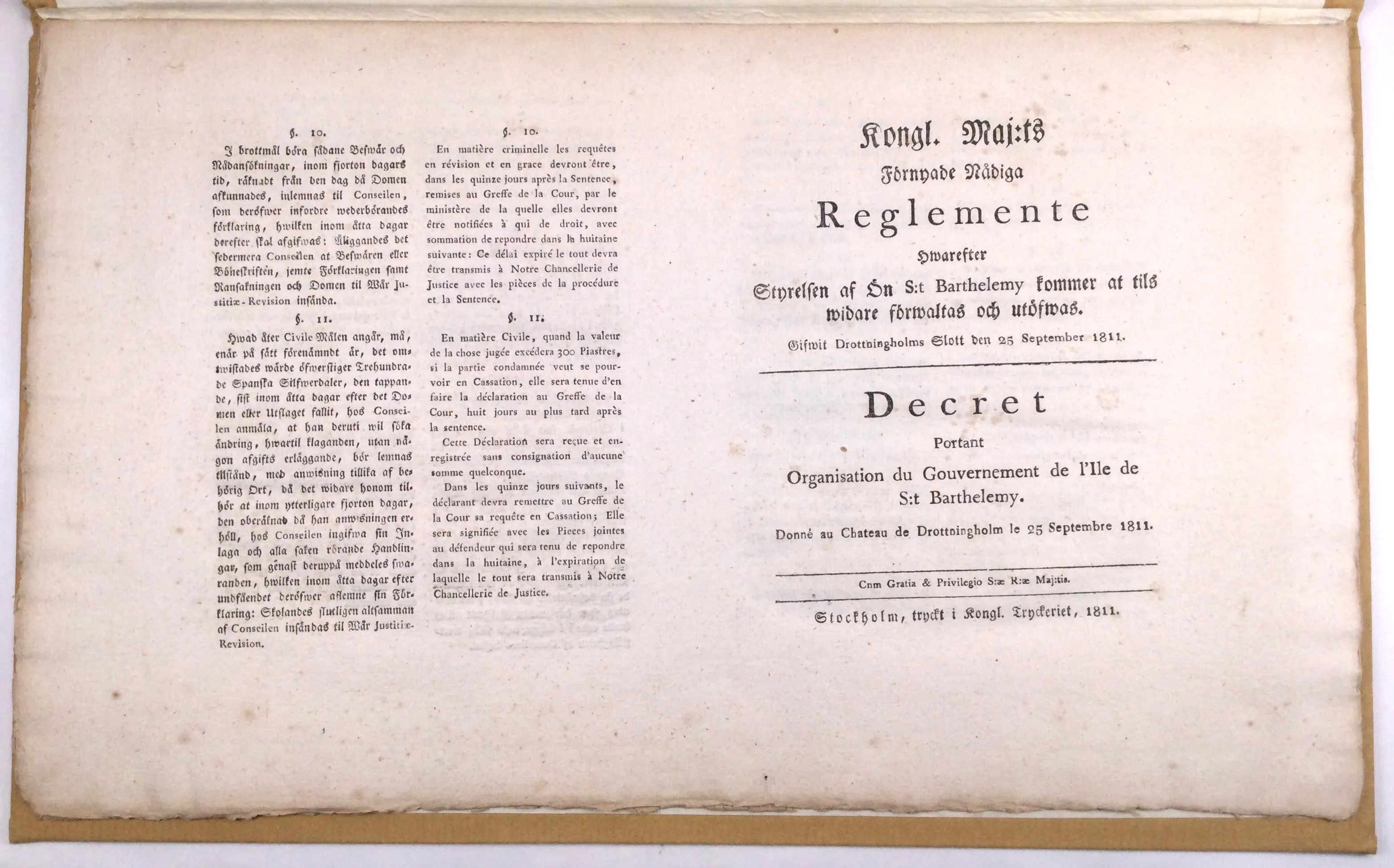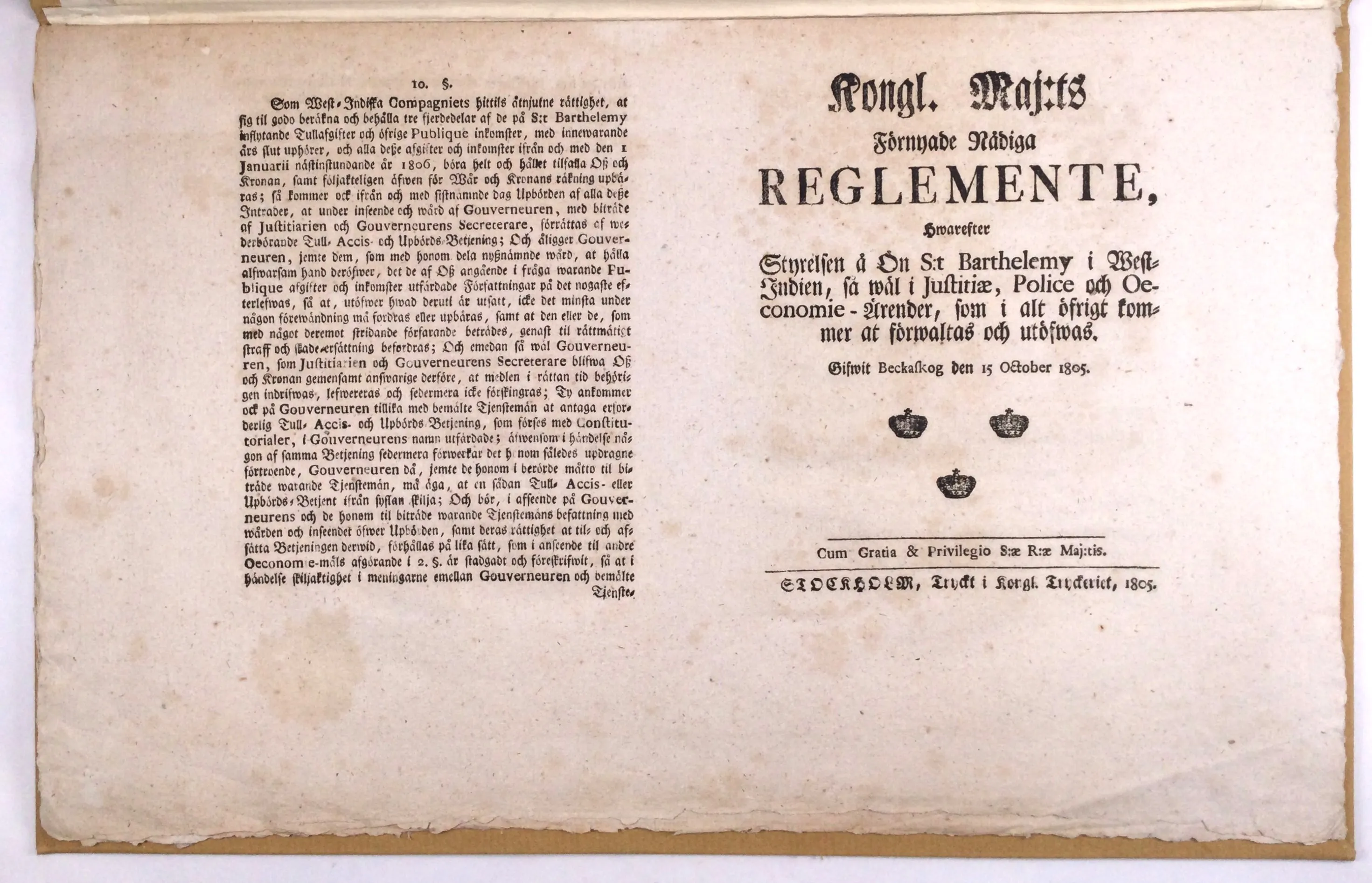 av Ön S:t Barthélemy 1786 samt förnyade reglementen 1805 och 1811. 8+12+20 sid. Samtliga bundna i nya pappband i folio med nutida kassetter (ateljé b). Mycket gott skick. (Est. SEK 2,000).