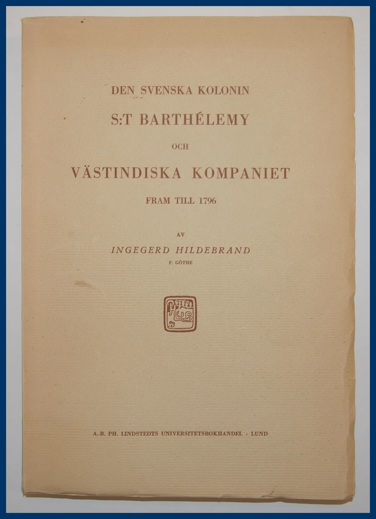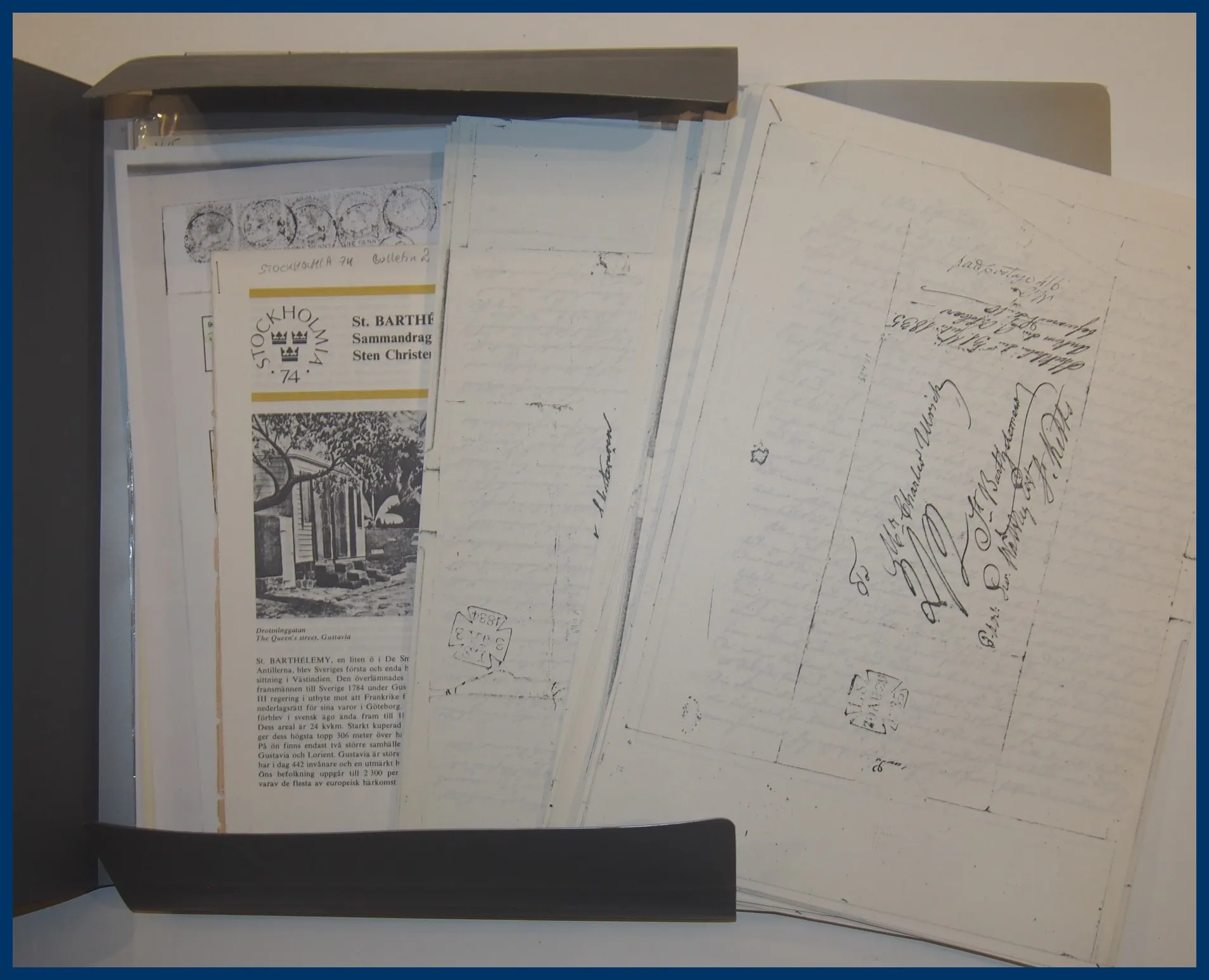Notera: Medföljer dokumentation och kopior på brevväxling till och från familjen Ulrich (19 brev, drygt 100 sidor, från 1833-1858). Ingegerd Hildebrands akademiska avhandling, Den svenska kolonin S:t Barthélemy och Västindiska Kompaniet fram till 1796 (350 sid), ingår.