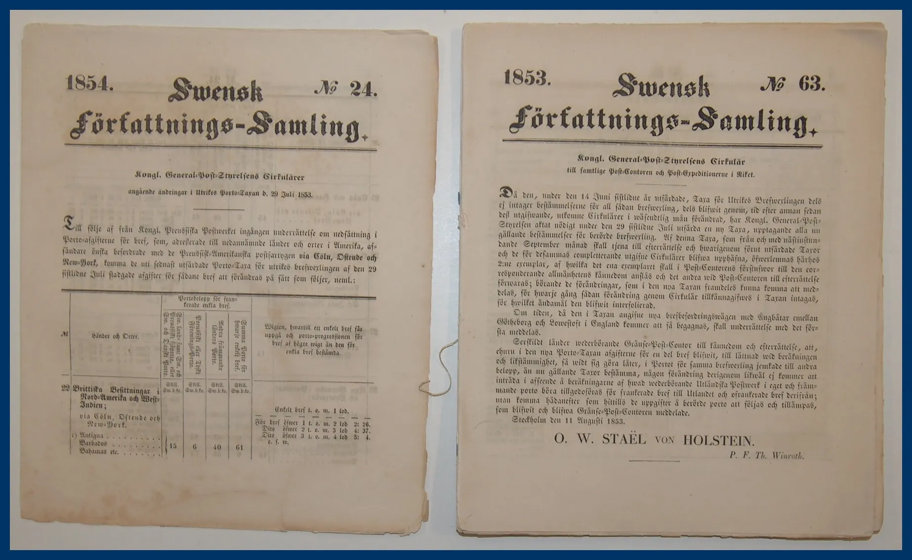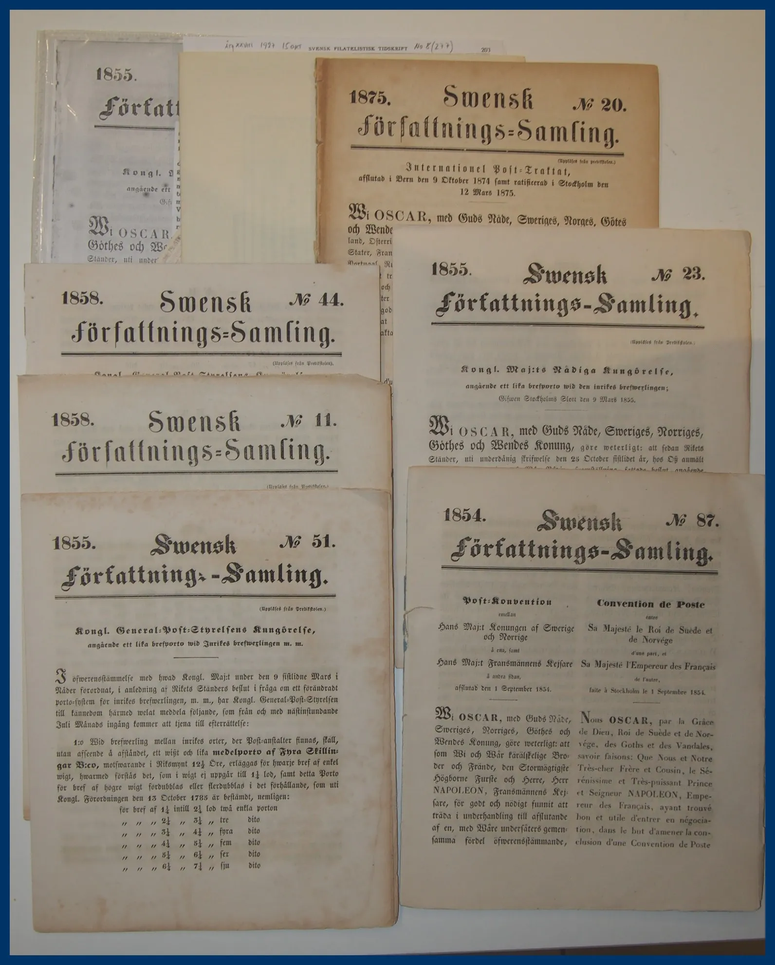 Författnings-Samling 1853 No 63, 1854 No 24, 1854 No 87, 1855 No 23, 1855 No 51, 1858 No 11, 1858 No 44, 1875 No 20. 148 sid. Lösblad i nutida kassett. Goda till godtagbara exemplar. (Est. SEK 8,000).