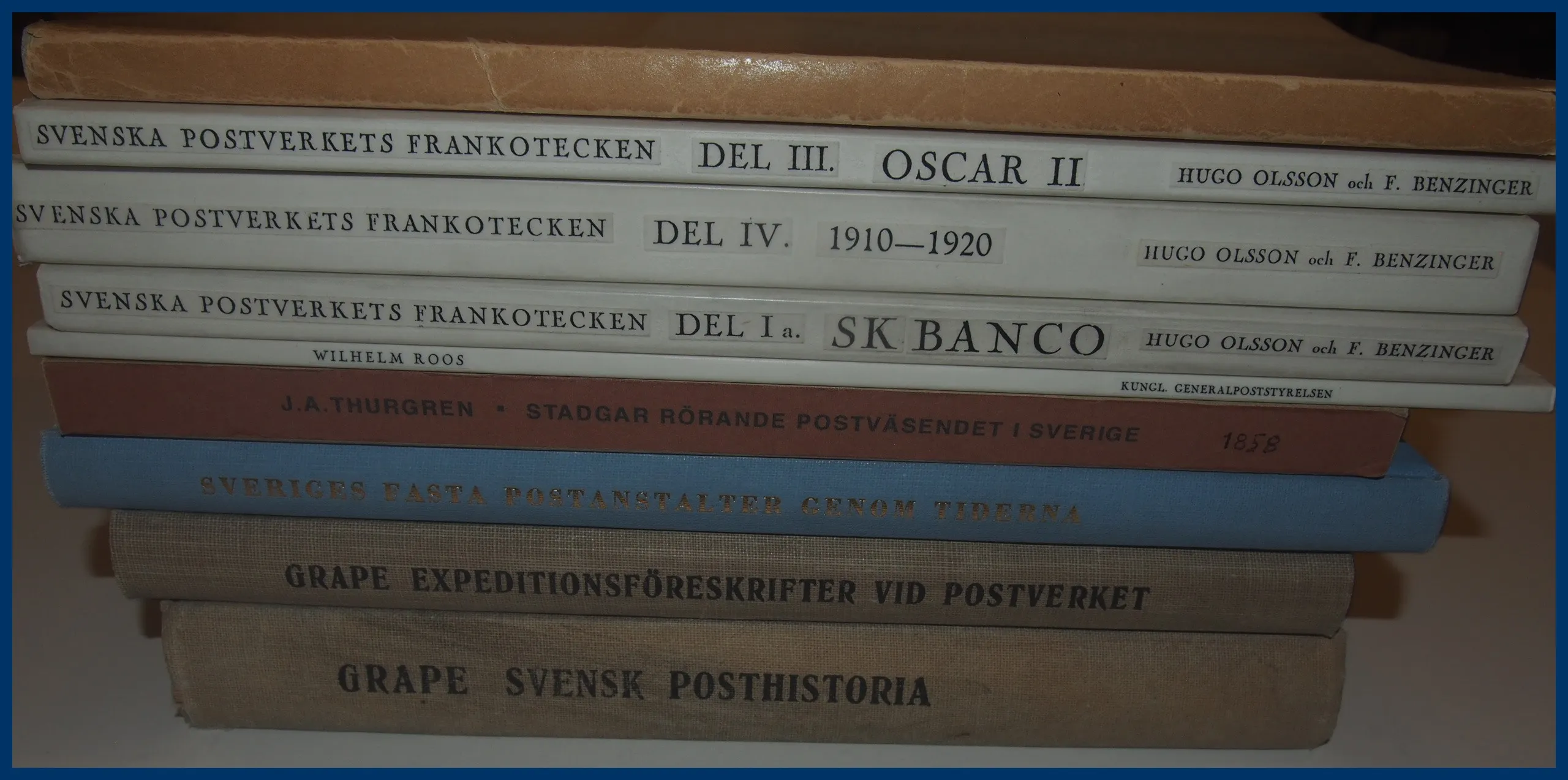 J.A. Thurgren: Stadgar rörande Postwäsendet i Swerige 1858 inbunden, Taxor för postångfartyg 1882, 1884 och 1912, Ernst Grapes Svensk posthistoria m.fl., Olsson/Benzinger: Svenska Postverkets frankotecken Del Ia, III och IV. (Est SEK 1,200).
