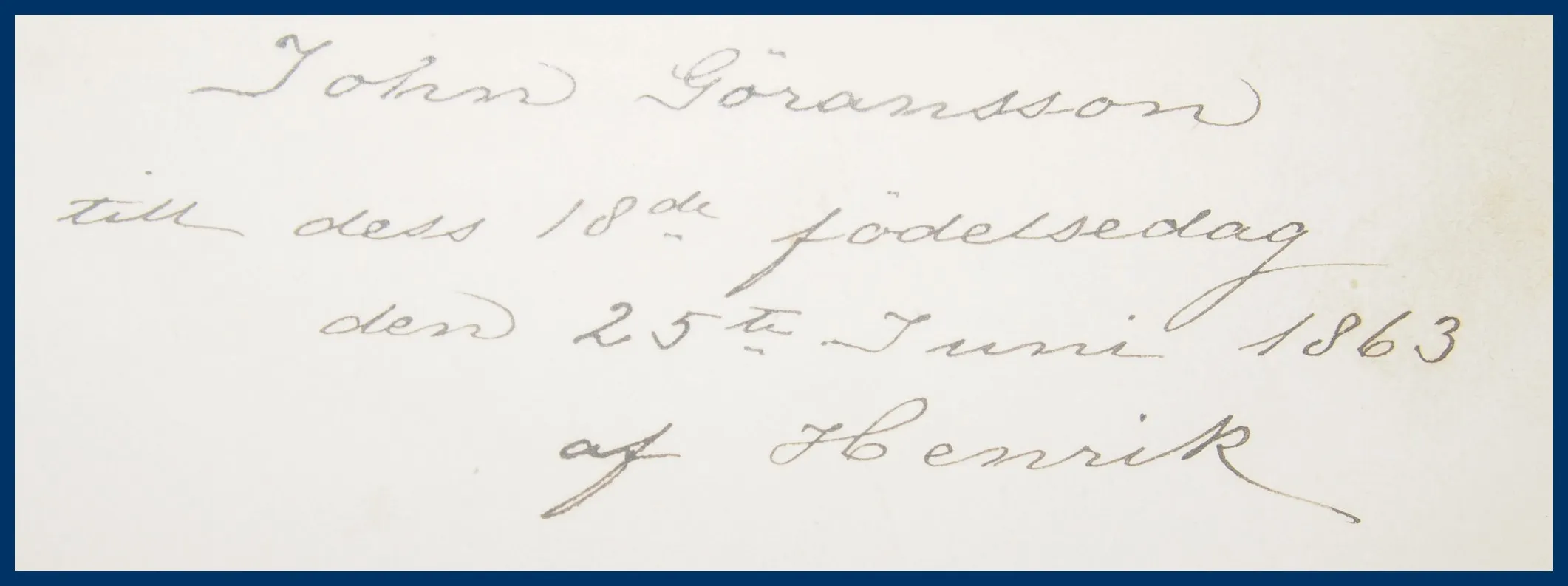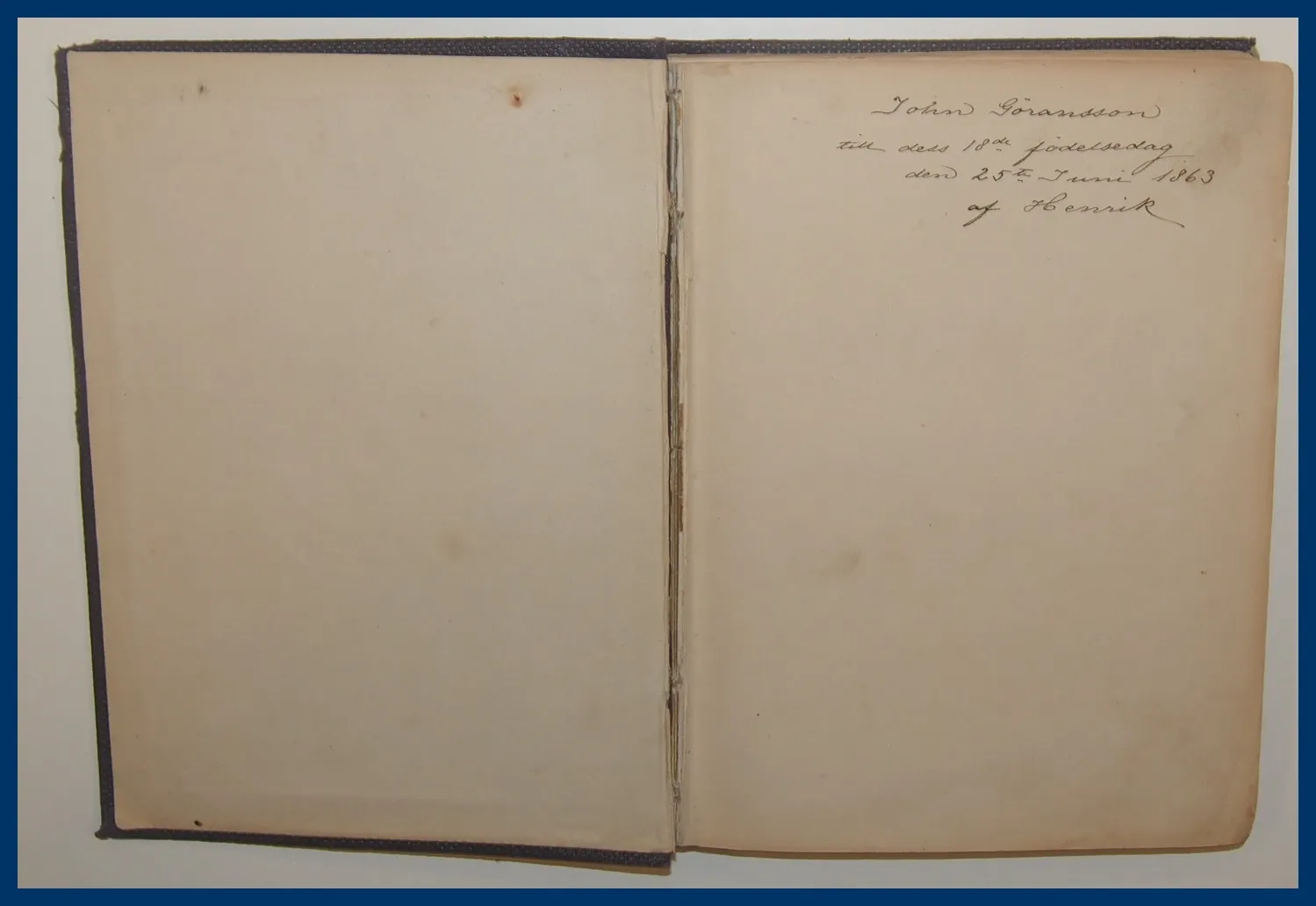 Notera: Tillskrivet "John Göransson till dess 18de födelsedag 25te Juni 1863 af Henrik". Wolfgang Maassen: Das erste Album eines Sammlers in Schweden PhH 1/2017 sid 95-103.