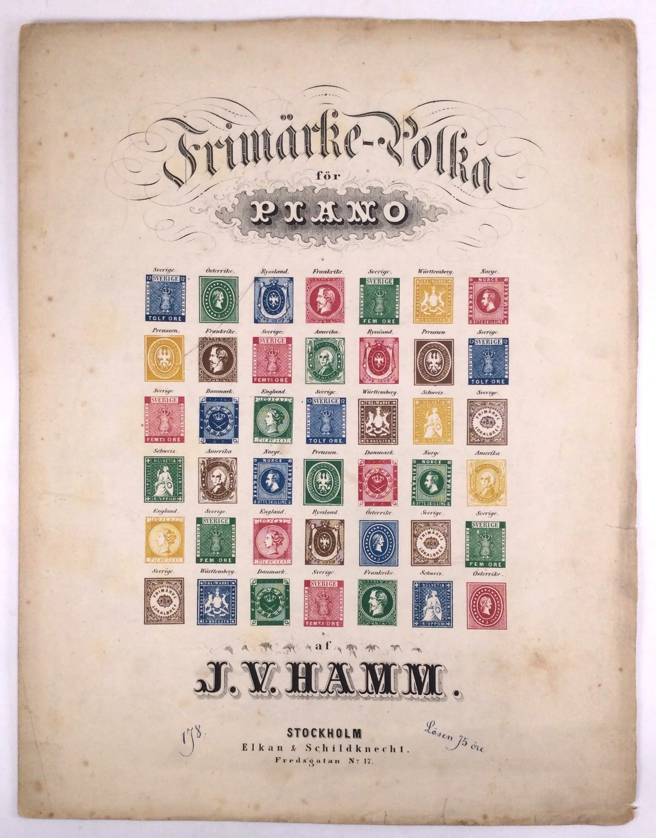 för piano. Ett blad i färgtryck som "avbildar" 42 frimärken från Europa och USA, i nutida hårdbunden kassett (a. baudry). Mycket gott skick. (Est. SEK 20,000). Notera: Utdrag ur Postryttaren 2009 av Björn Sylvan medföljer.