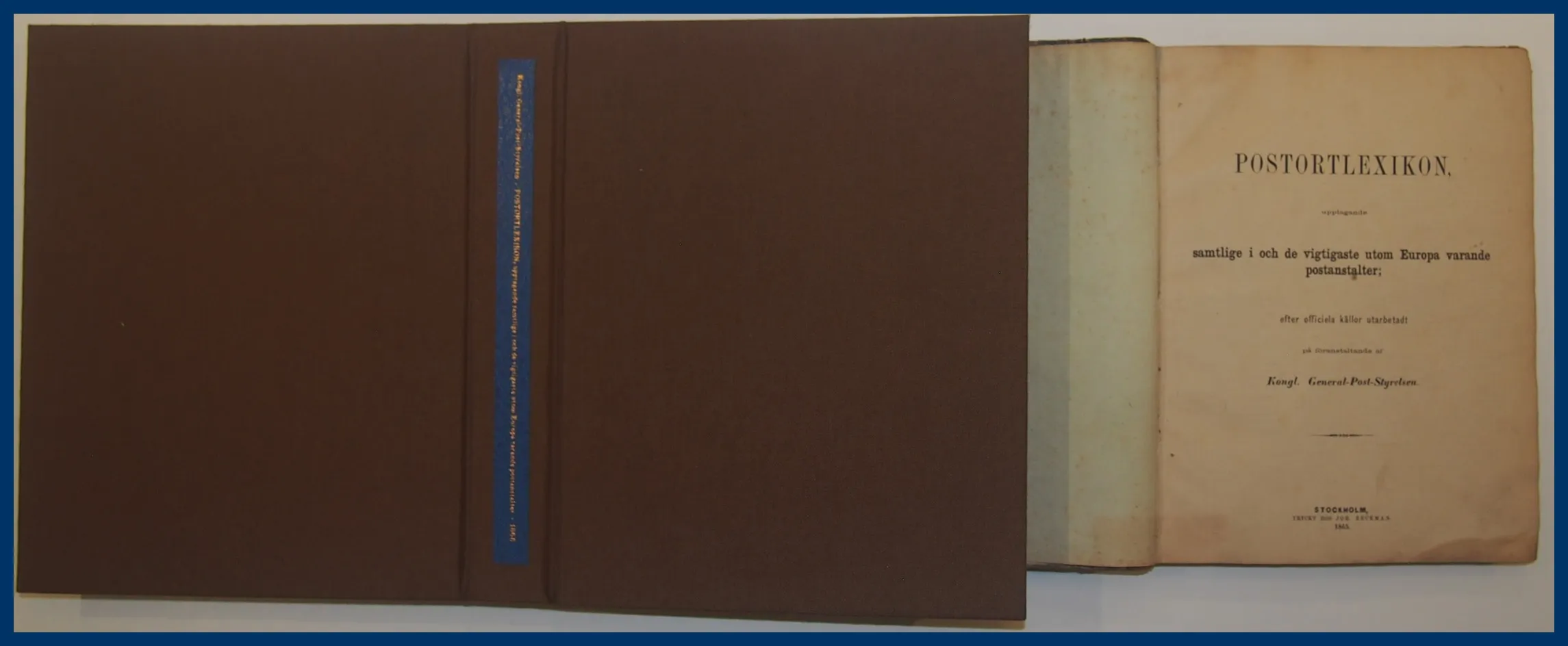upptagande samtlige i och de vigtigaste utom Europa varande postanstalter. 216 sid. Samtida privatband i nutida hårdbunden kassett (ateljé b). Godtagbart skick. (Est. SEK 1,000).