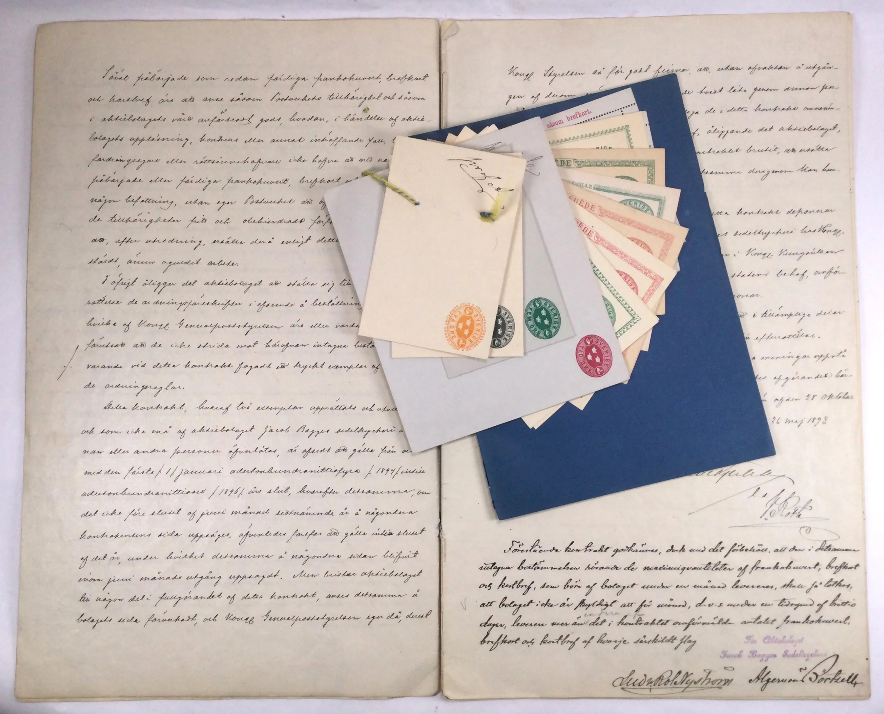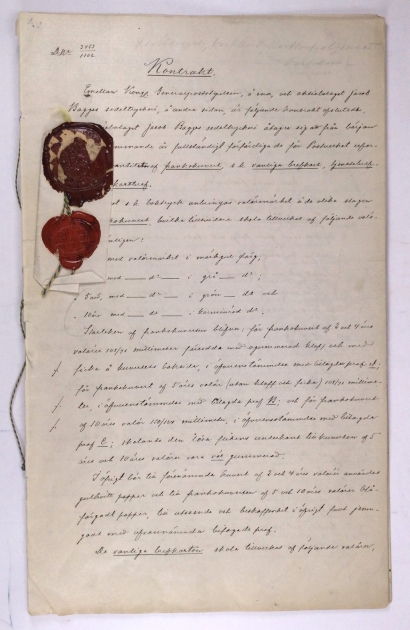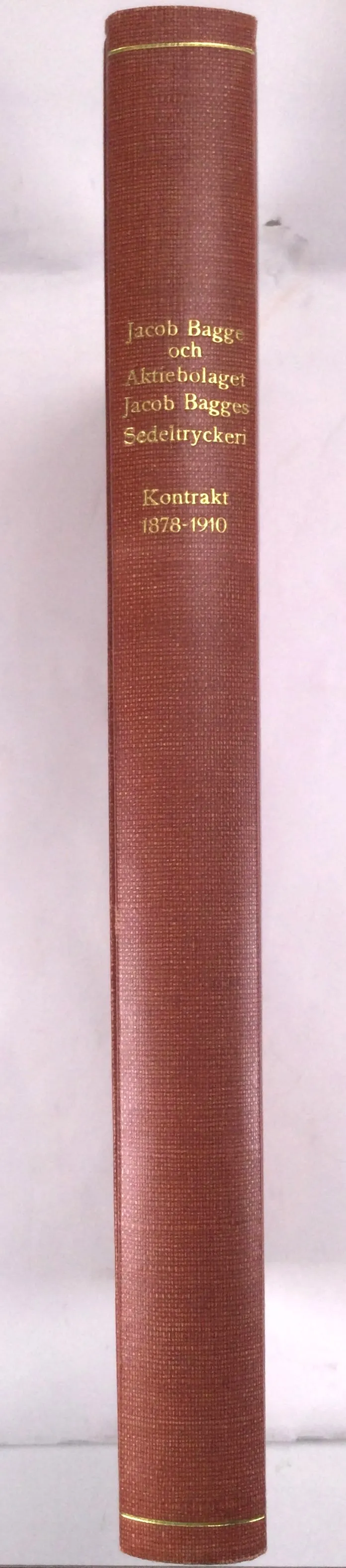 Sedeltryckeri. 9 kontrakt i original 1879-1909, med 20 helsaksprover och 13 pappersprover + kopior i inbundet band (Leonard Gustafsson), 229 sid. Originalhandlingar med sigill i nutida kassett (ateljé b) + kopior på samtliga kontrakt inbundna 1970-tal. Originalhandlingar i mycket gott skick, inbunden bok i nyskick. (Est. SEK 40,000).