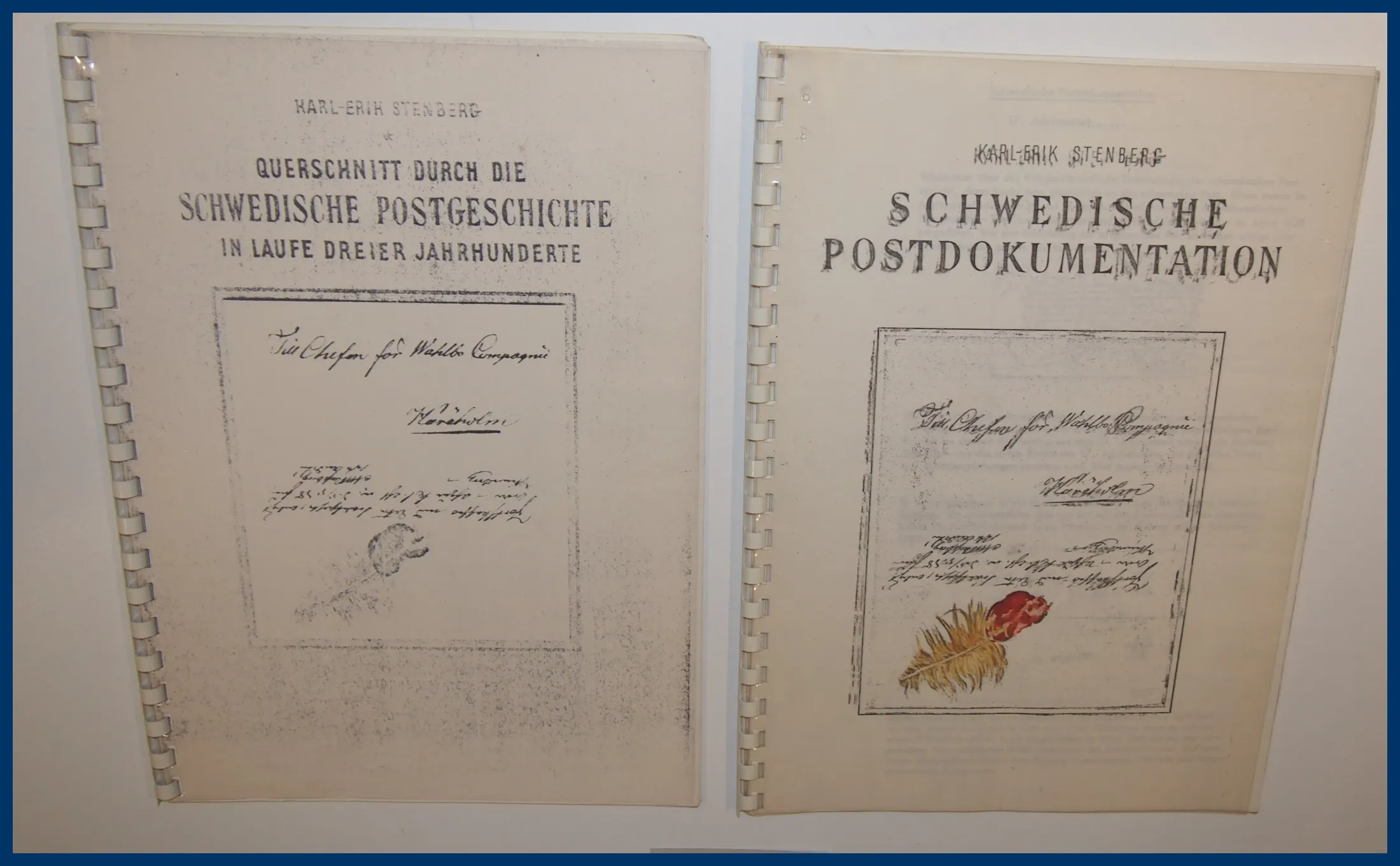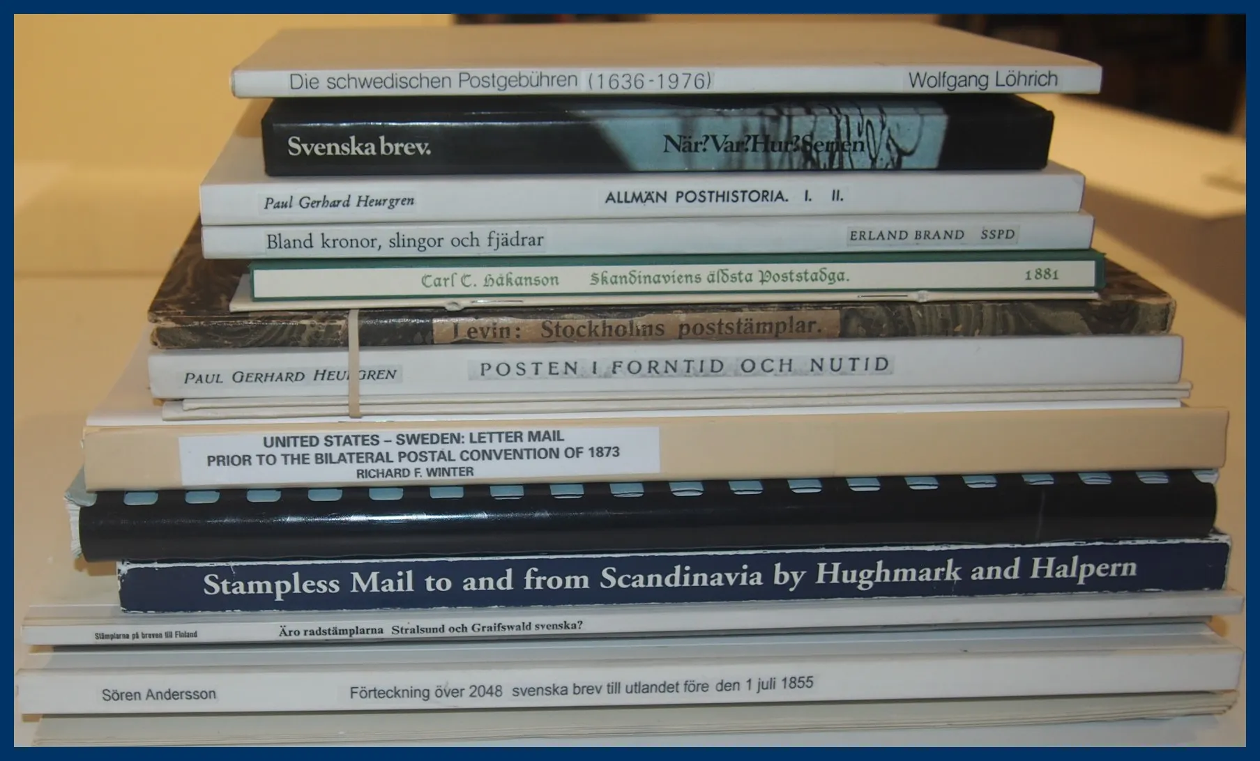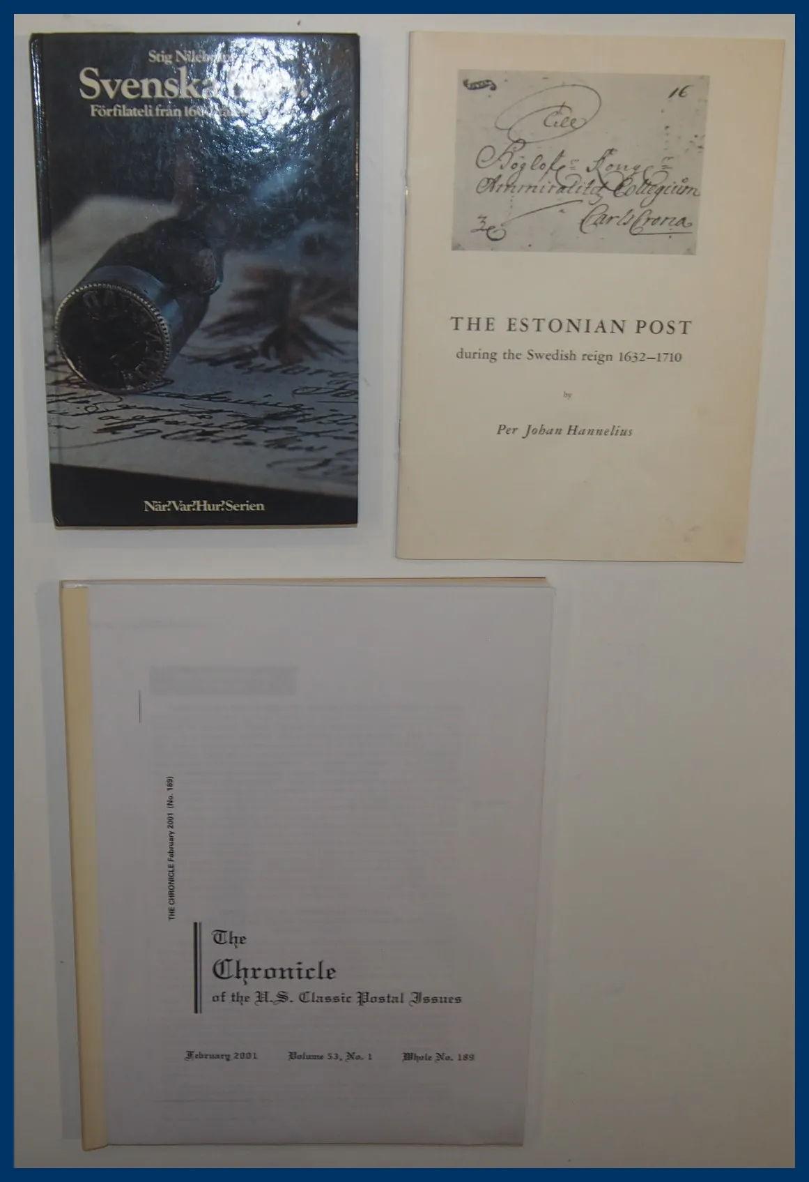 bl.a. Carl C. Håkanson, Skandinaviens äldsta poststadga (faksimil 1881) i vackert band och kassett (ateljé b) samt Levin, Astley, Stockholms poststämplar 1686-1910, inbundna och häftade. Gott skick. (Est. SEK 1,000).