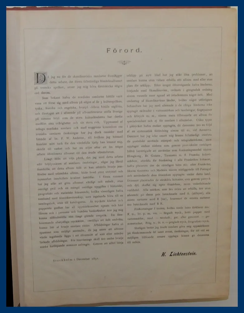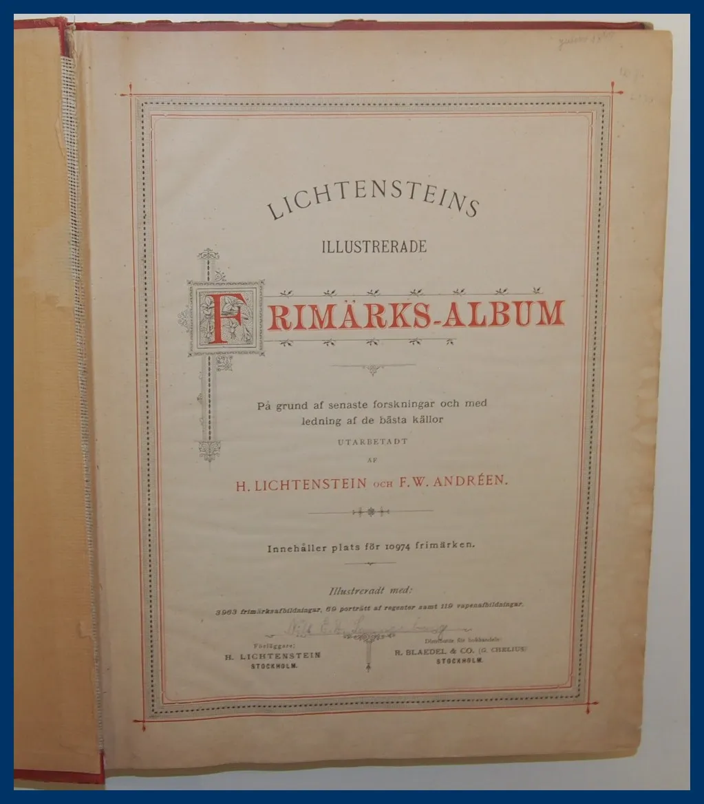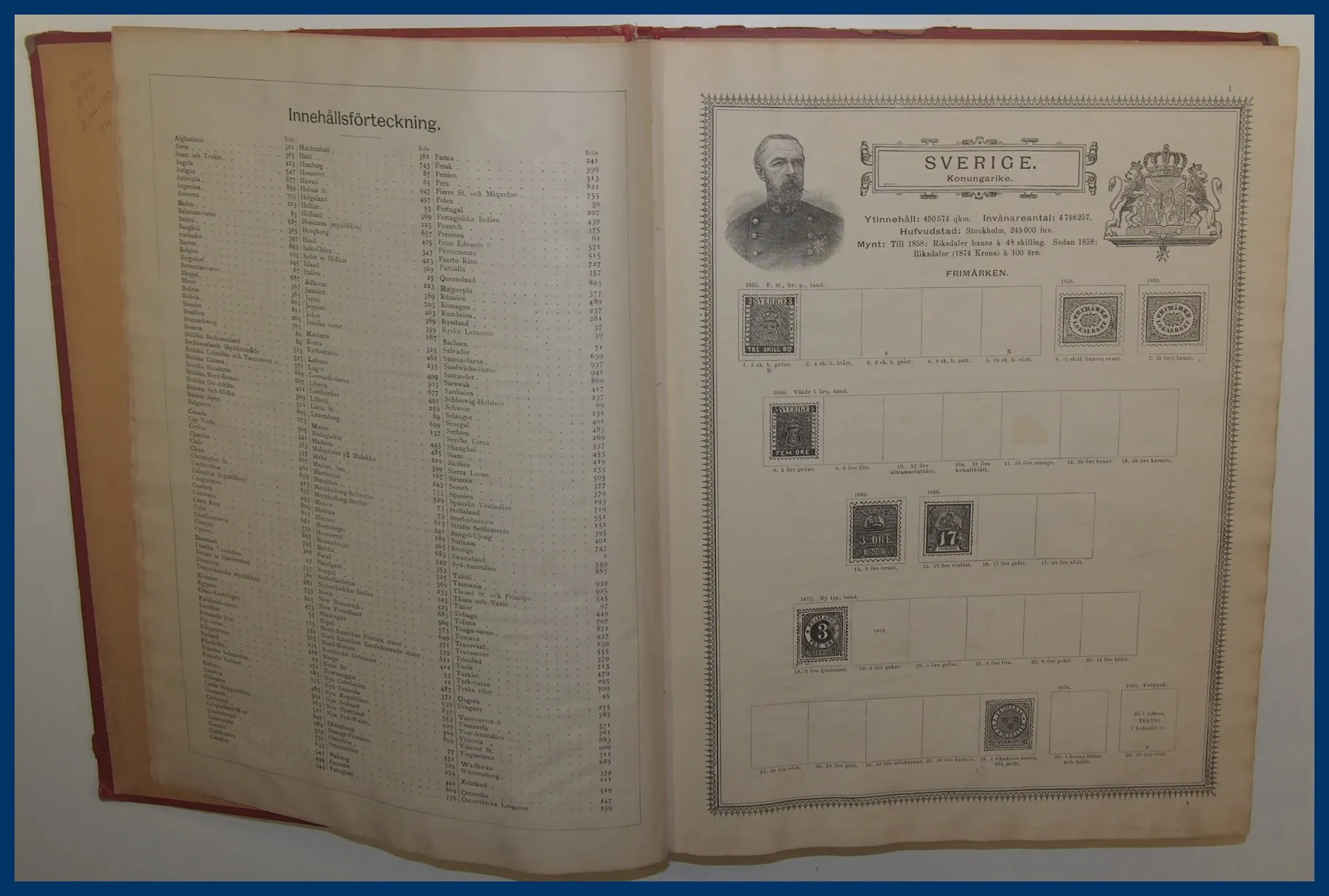 illustrerade Frimärks-album. 946 sid. Världsomfattande album, det första svenska albumet inbundet med svensk text. Inga frimärken ingår, få fastsättarrester. Nutida kassett. Gott skick. (Est. SEK 1,000).