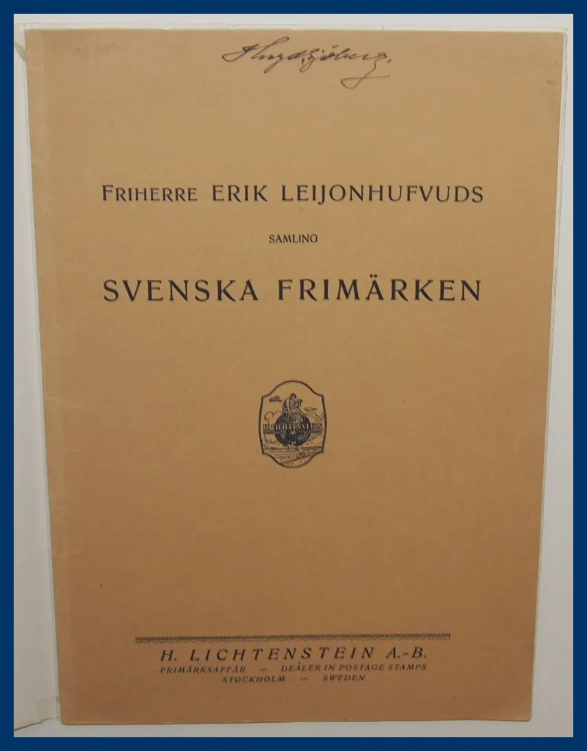 Leijonhufvuds samling svenska frimärken. 16 + XIV sid. 1,285 lots inklusive Tre Skilling Banco Gul. Illustrationer. Limhäftad med mjuka pärmar. Gott skick. (Est. SEK 2,000).