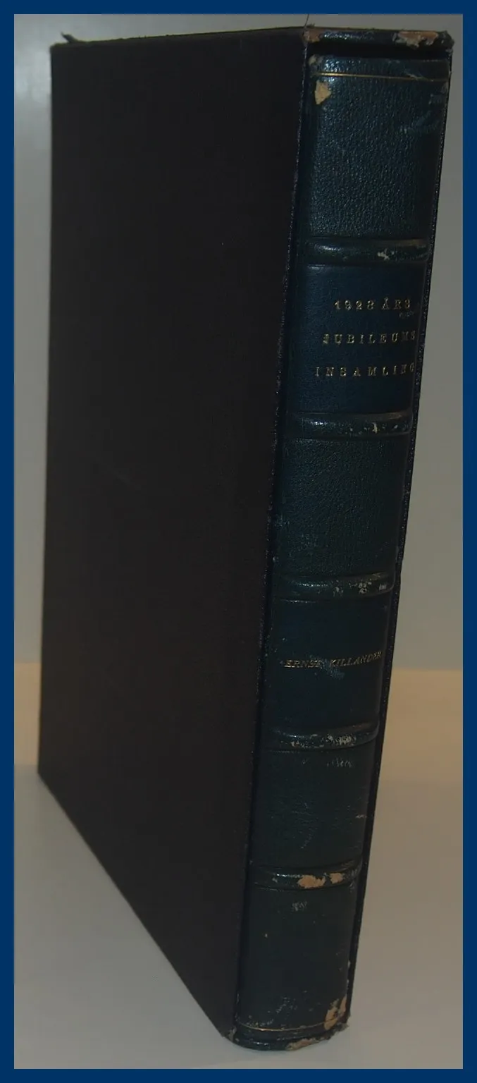 Notera: Inbunden lyxupplaga med helark (40 frimärken) av frimärksutgåvan (fem olika valörer) övertryckt Makuleras. Helt guldsnitt, samtida kassett. 368 sid. Nr 20, upplaga 800. Medföljer kort för insamling till Jubileumsfonden (helark).
