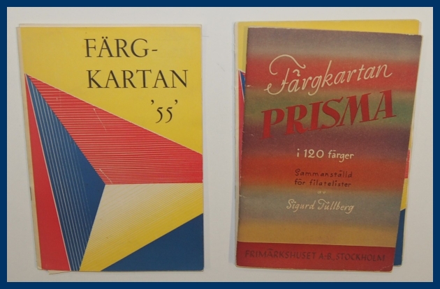 (2 exemplar) m.fl. Klammerhäftade med lösa färgkartor i samtida kassetter (ateljé b). Färgkartan '55', Färgkartan Prisma och Nordisk Filatelis Färglikare medföljer. (Est. SEK 1,000).