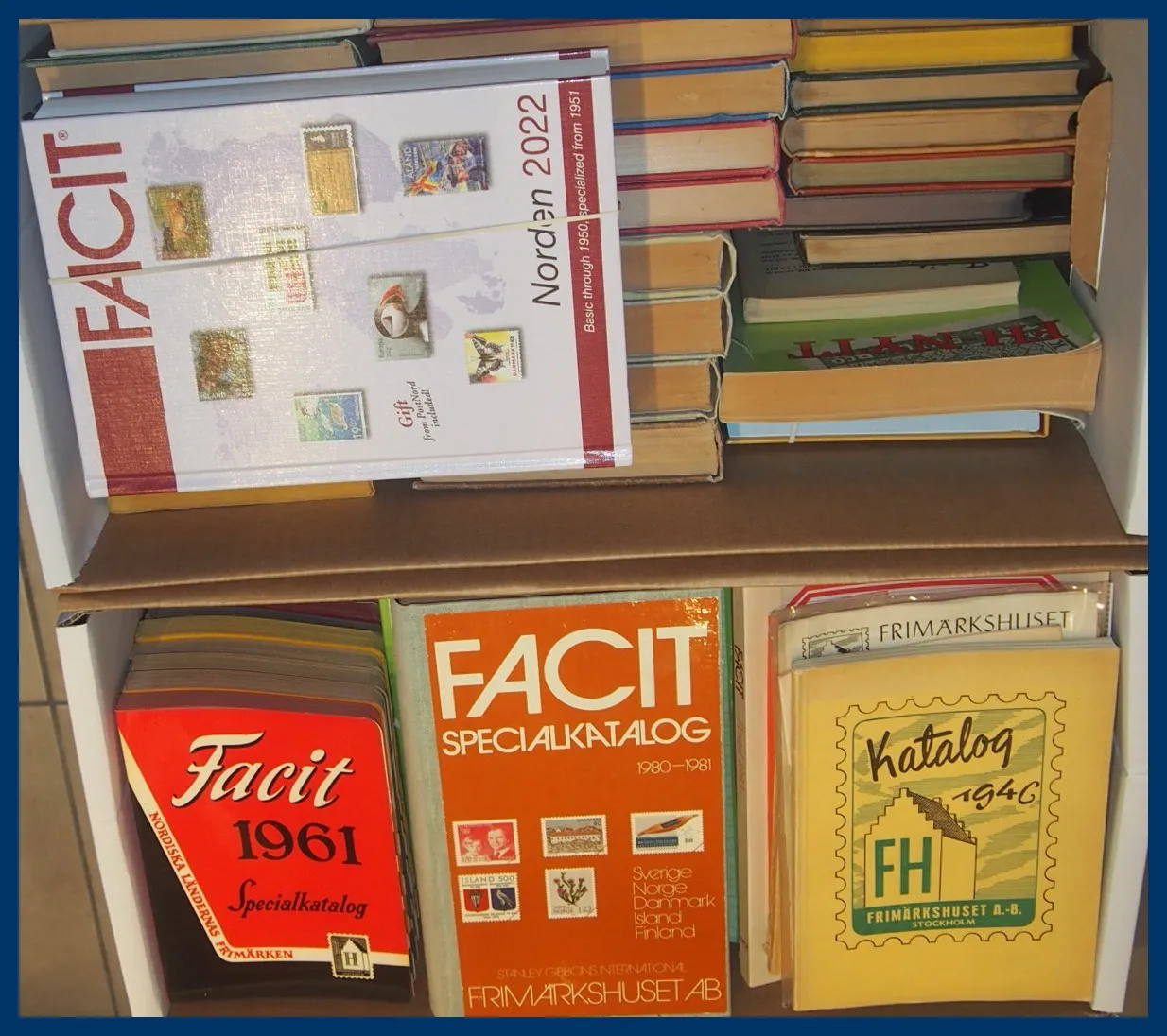 1948-1957 inbundna (1949 häftad), 1958-1959, 1961-1969 (mjuka pärmar), 1970-1975/76, 1977/78 - 1981/82, 1983-1992 (delvis inbundna), 1993/94-1994/95, 1996/97-1998/99, 2002-2003, 2005-2009, 2012-2013, 2015, Facit Postal 1993 och Postal IV. Katalog över de nordiska ländernas frimärken 1943-1944 samt 1946, Lilla Facit 1959, Facit Sverige 2023, Facit Norden 2022, Facit Special 1948-2022 History & Index (2022). Slitet - gott skick. (Est. SEK 1,200).
