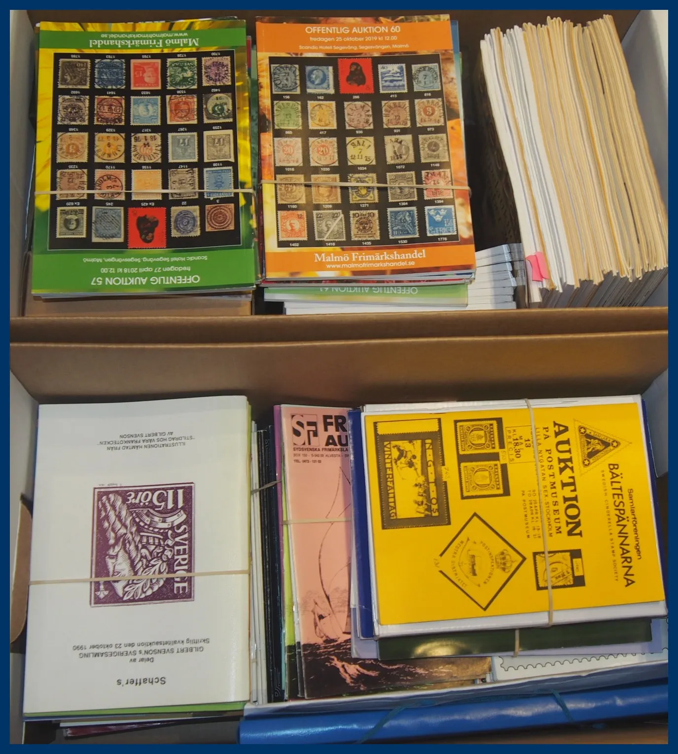 (1985-1991), Malmö Frimärkshandel nr 32-53, 55-63 (2005-2021), Björn Jarlvik 1993-2024, Nova Frimärken AB 1980-2008, Swestamp AB (2013-2023), Junefrimärken nr 1-18 (1980-1989), Svea Mynt- och Frimärksauktioner 1978-1982 samt auktionskataloger från ett stort antal mindre eller kortlivade auktionsföretag. Gott skick. (Est. SEK 600).