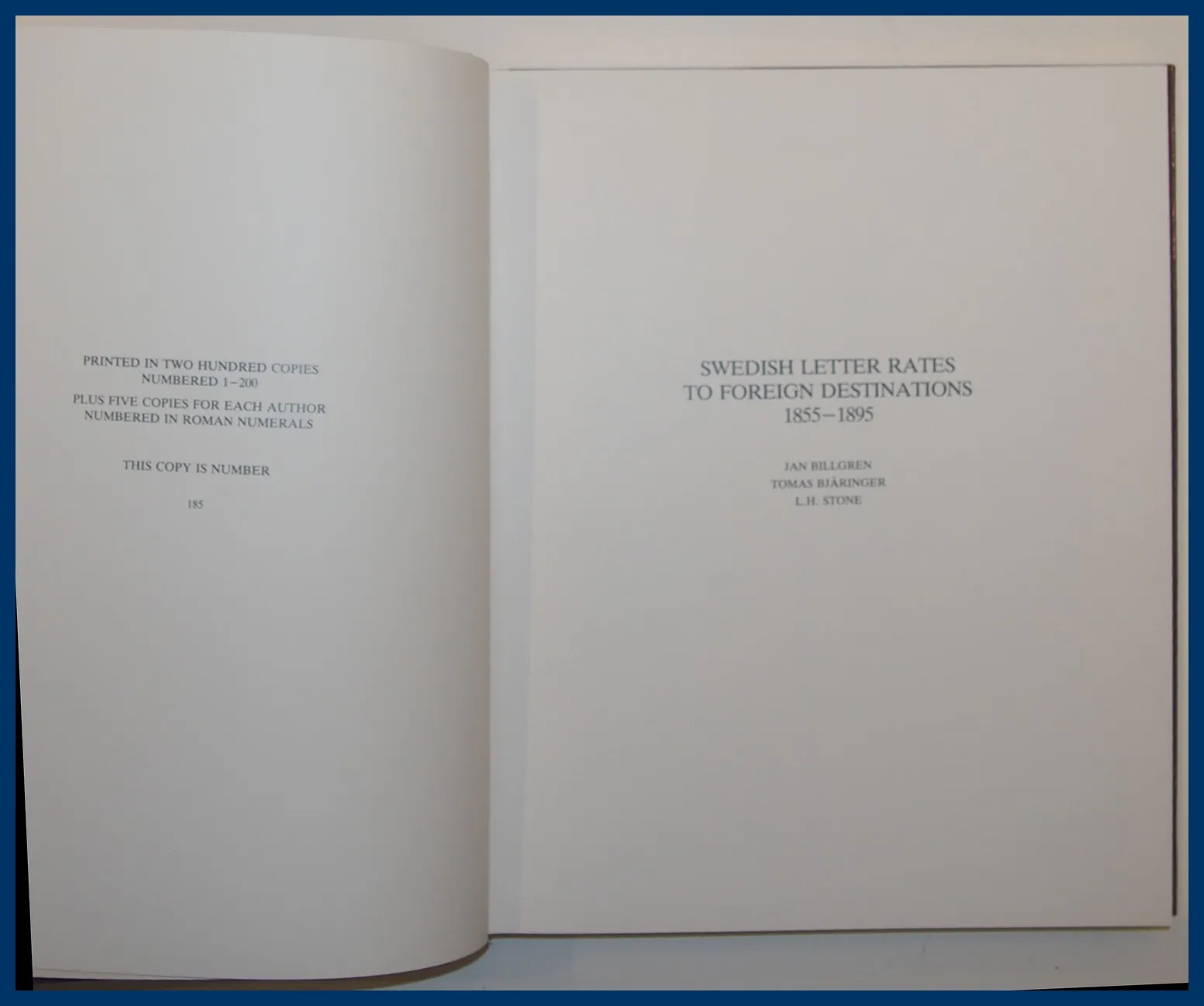 Swedish Letter Rates to Foreign Destinations 1855-1895. 235 sid. Mycket gott skick. (Est. SEK 3,000). Nyskick.