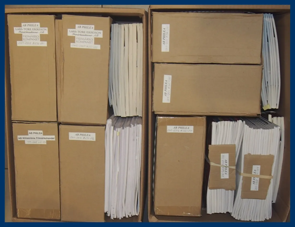121-234 (1999-2005), Philea/Frimärkskompaniet (2 st 2004-2005), Frimärkskompaniet/Lars-Tore Eriksson Frimärksauktioner (5 st 2005-2007), Philea nr 235-402 (2007-2024) med flertalet resultatlistor. Ingår även auktionslistor från SFT (nr 6-17). Gott skick. (Est. SEK 1,000).