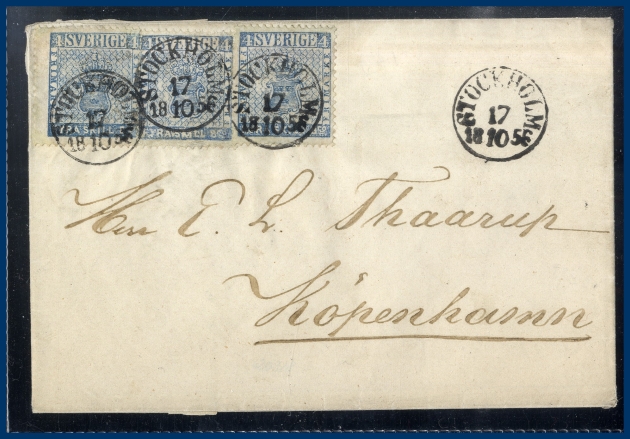 "STOCKHOLM 17.10.1856". Utlåtande Nilsson (2025) Ett nätt och ovanligt brev, Äkta men samtliga märken har varit avtagna och reparerade i marginalerna.