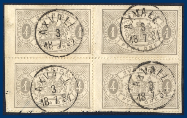 322. 4 öre Stora Tjänste t.14 (Tj.2) i vackert fyrblock på klipp