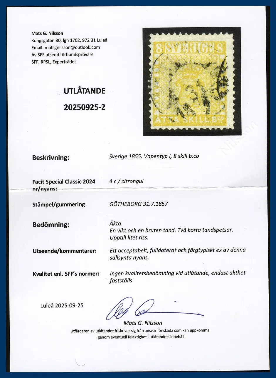 "GÖTHEBORG 31.7.1857". Utlåtande Nilsson (2025) Ett acceptabelt, fulldaterat och färgtypiskt exemplar av denna sällsynta nyans. Äkta med en vikt och en bruten hörntand, 2 ktt, upptill litet riss.