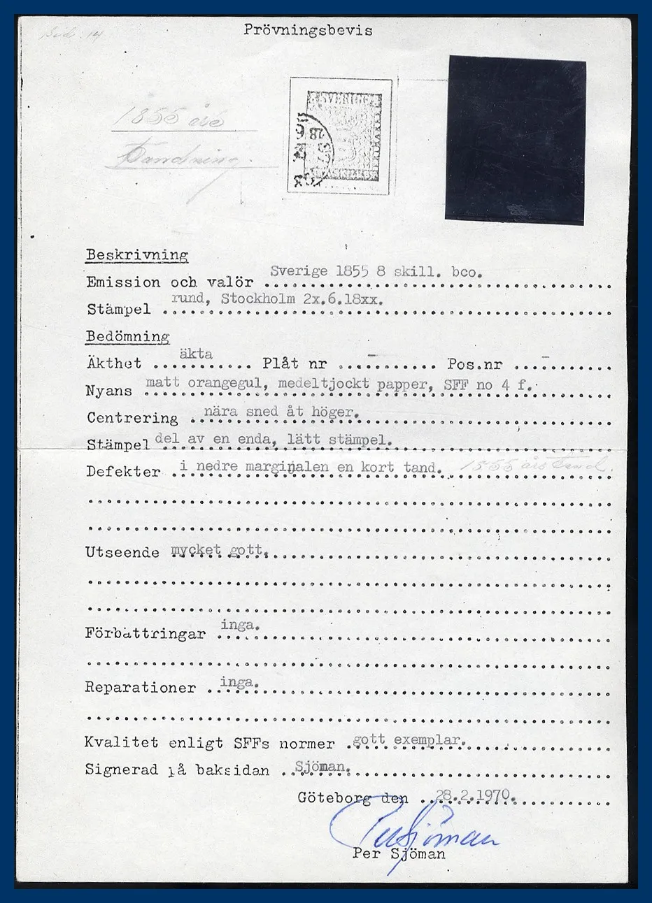 Stockholm. Intyg Sjöman (1970) gott exemplar, i nedre marginalen en kort tand. Ovanlig nyans.