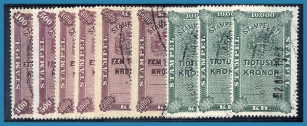 227. 9 st stämpelmärken Stora Riksvapnet 1895 med höga valörer: