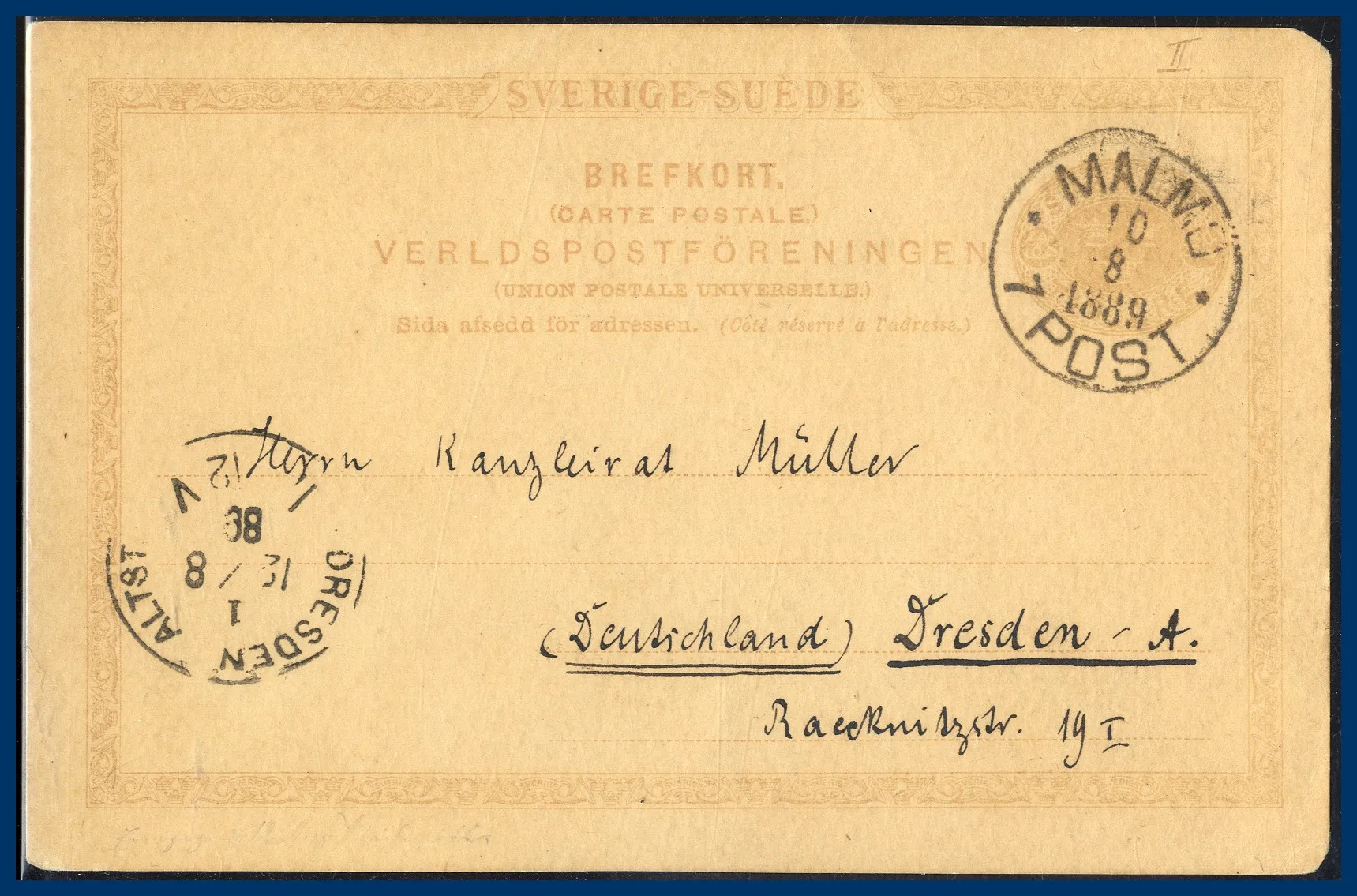 442.bke 13 stämplat MALMÖ 7 POST (M) 1889-08-10 N10 typ 1,