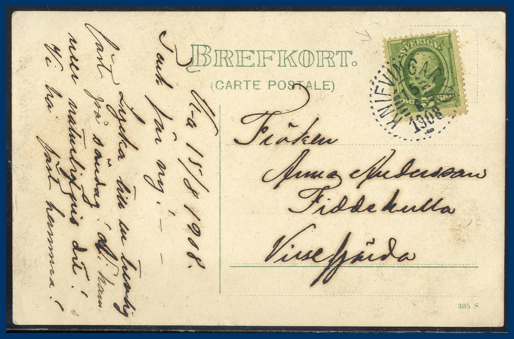 351.KNIFVINGARYD (H) 1908-08-15 N33 Postal 150 kr (vikt ht)