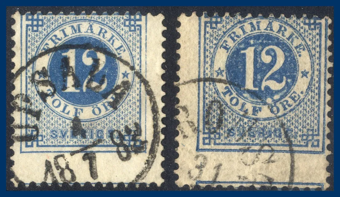 2 märken med del av andra frimärksbild i nedre marginalen, det högra märket med riss och hörnveck.