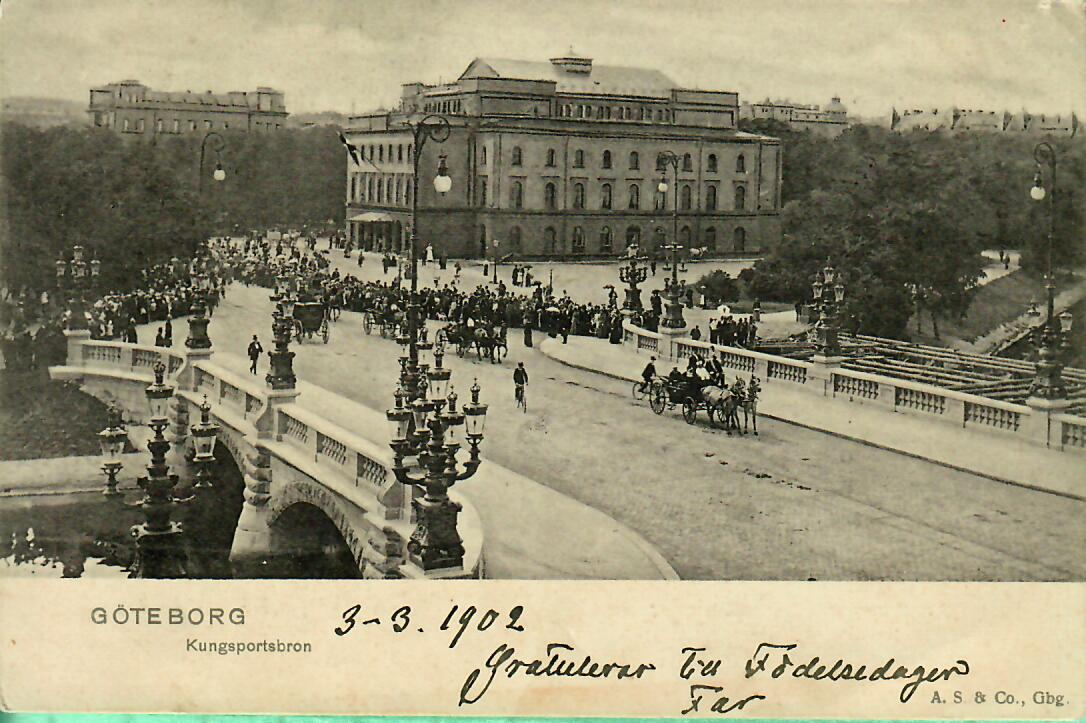 Kungsportsbron, med Oscar II på besök omgiven av cyklande poliser.