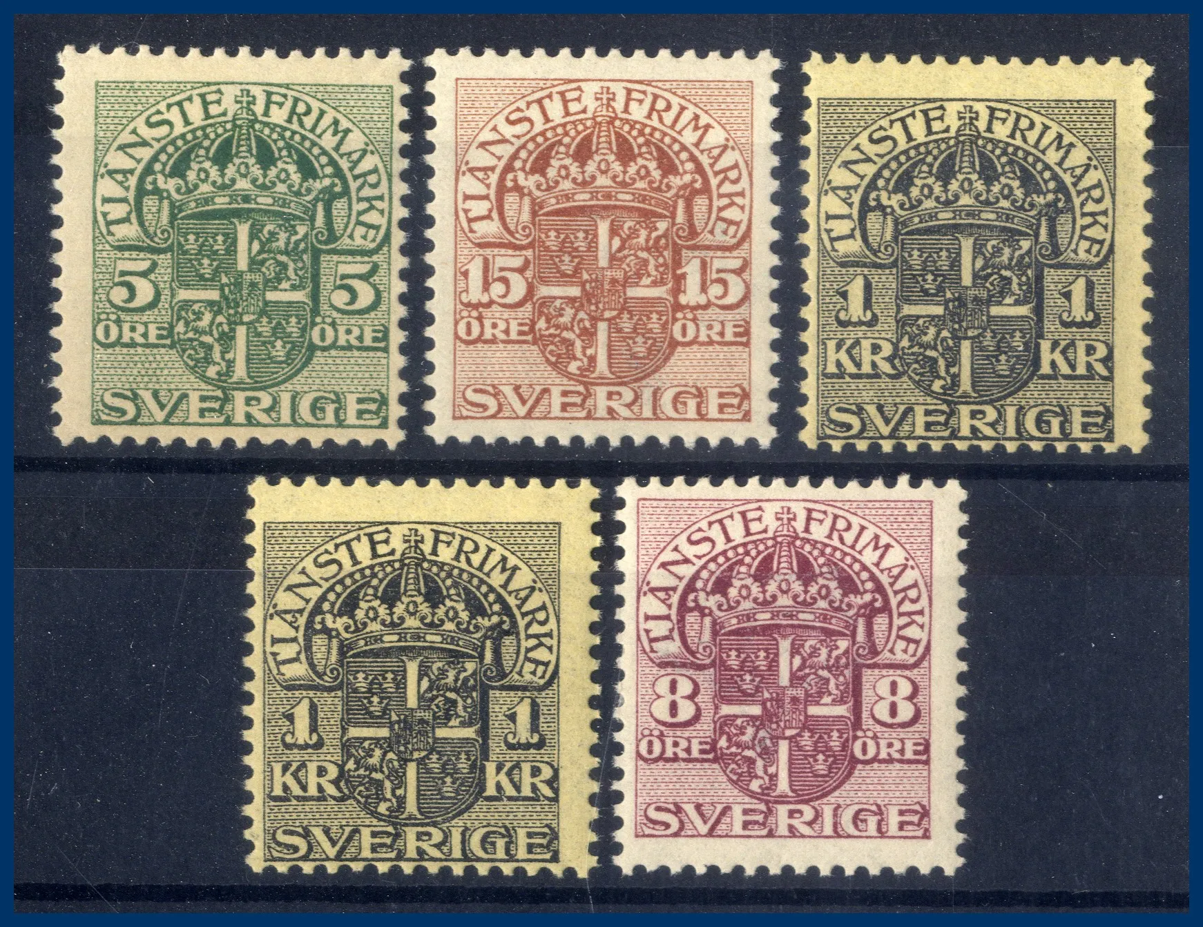 363. Omvänd vm krona på 5 olika märken: 5 öre +15 öre + 1 kr
