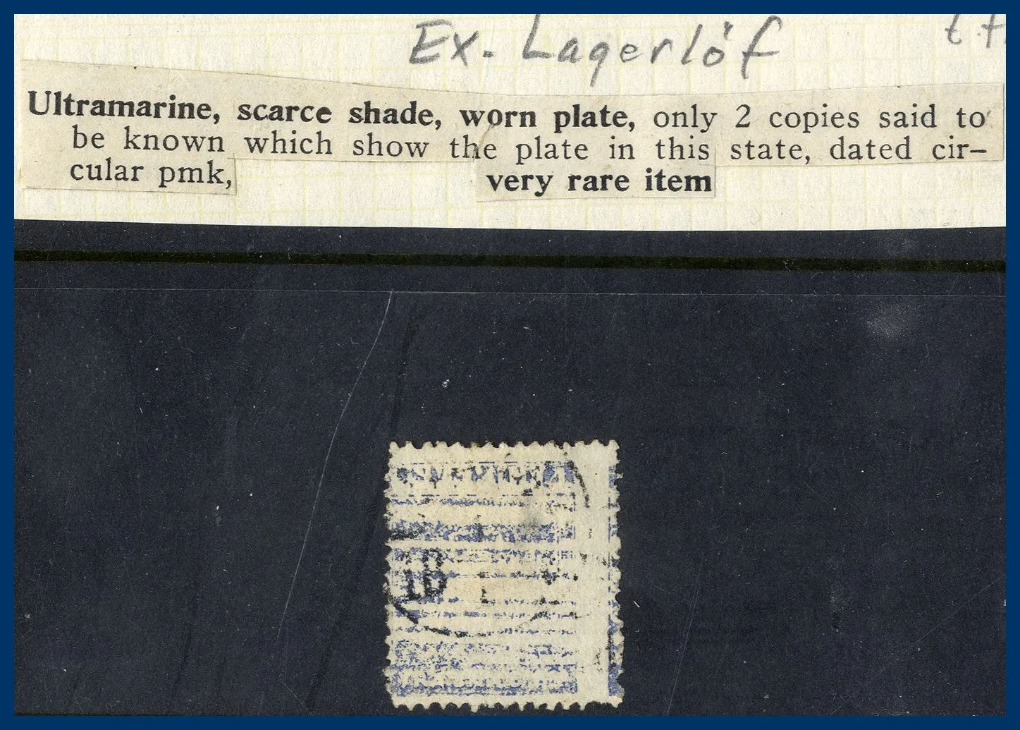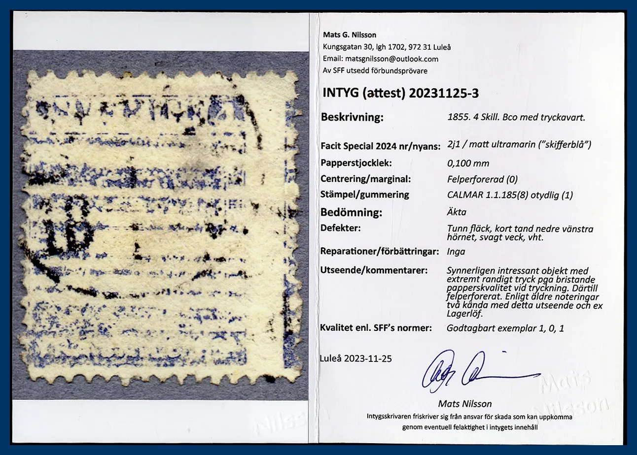 otydligt stämplat "CALMAR 1.1.185(8)". Intyg Nilsson (2023) Synnerligen intressant objekt med extremt randigt tryck pga bristande papperskvalitet vid tryckning, därtill felperforerat. Obetydliga defekter enligt intyg. Enligt äldre auktionsnoteringar (Harmers 1942) 2 kända med detta utseende. Ex. Lagerlöf. Troligen unikt.